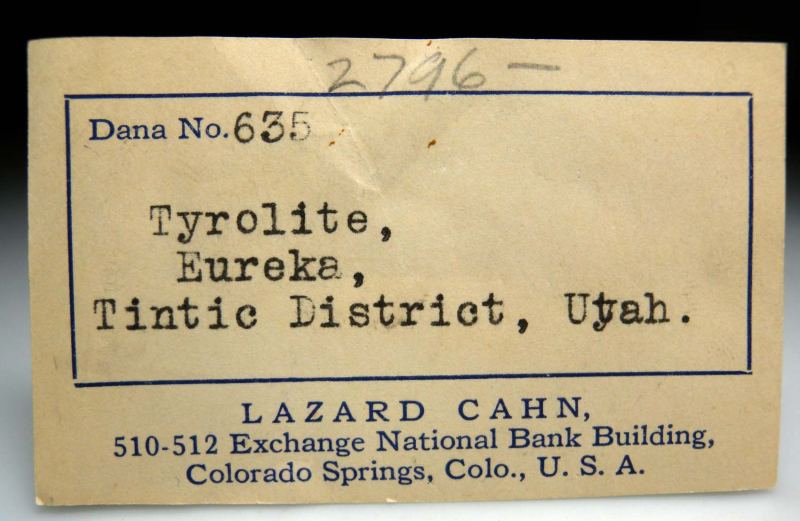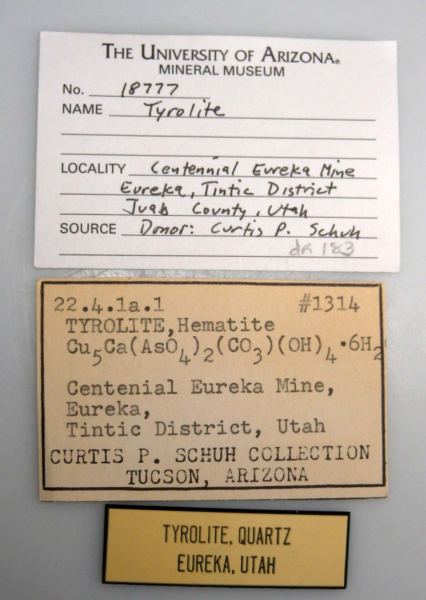 Historic specimen of green Tyrolite on matrix from Tintic. Ex. Lazard Cahn, Curtis Schuh, Ben Schumer, and University of Arizona collections and comes with 5 old labels plus an engraved plastic show display plaque. Curtis Schuh's label indicates he bought the specimen in January 1979 for $85 from Western Minerals and 'excellent crystals sprays on hard Quartzite matrix'.Data last checked on 4th Mar 2026