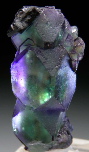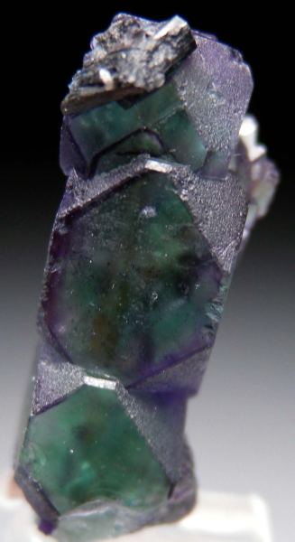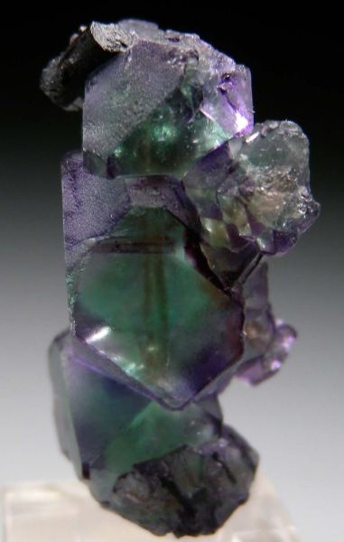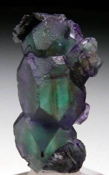 Stacked cluster of rectangular-shaped Fluorite crystals with attached schorl from the Eongo Mountains. The Fluorite are complete all around, transparent, and purple and green in color. There appears to be a slight faden line running up the center. Very transparent and fine.Data last checked on 4th Mar 2026