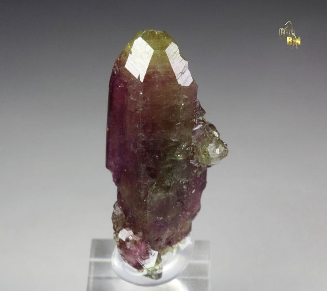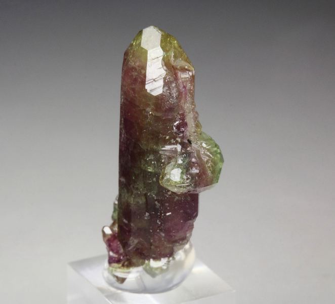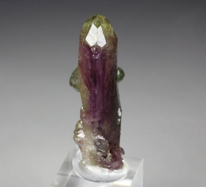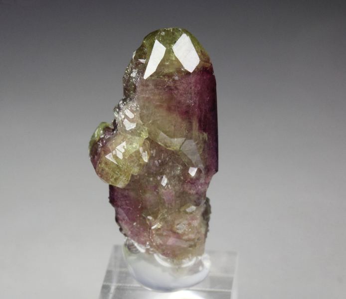 A cool specimen of vesuvianite crystals from the famous Jeffrey mine, Quebec, Canada. They have from purple color to apple-green at the tips. The crystals are gemmy with a glassy luster and strong light reflection. The vesuvianite crystals are well shaped and sharp with pointy tips. They are fresh and sparkling. For references see the 2013 issue of The Mineralogical Record vol. 44, # 4. In very good condition – some contacts towards the back side. On acrylic base., Marvelous!, Data last checked on 6th Mar 2026 - specimen may no longer be available