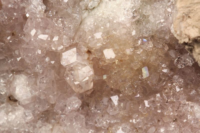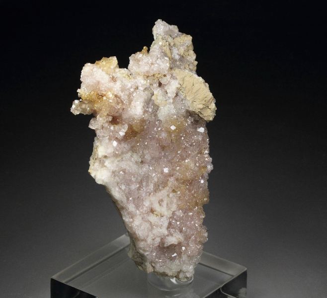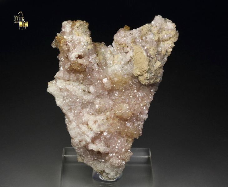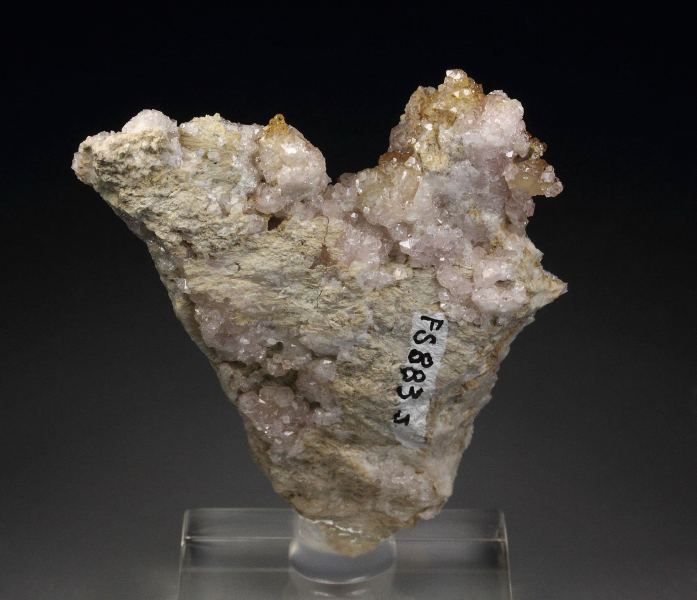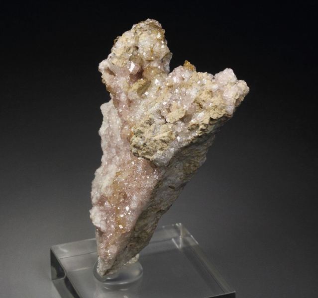 A wonderful specimen of pink colored grossular garnet crystals to 2mm from the famous Jeffrey mine, Quebec, Canada. It comes from the renowned collection of Francesco Spertini, Quebec, Canada (identified by a collection number on the back; no label present). The grossular crystals are transparent and gem quality, displaying strong luster and a delicate, pleasing pink color. Pink grossulars from this classic, now-closed locality are quite rare and highly sought after by collectors. For references see the 2013 issue of The Mineralogical Record vol. 44, # 4. In good condition – some contacts. On acrylic base., Splendid pink garnets!, Data last checked on 8th Mar 2026 - specimen may no longer be available