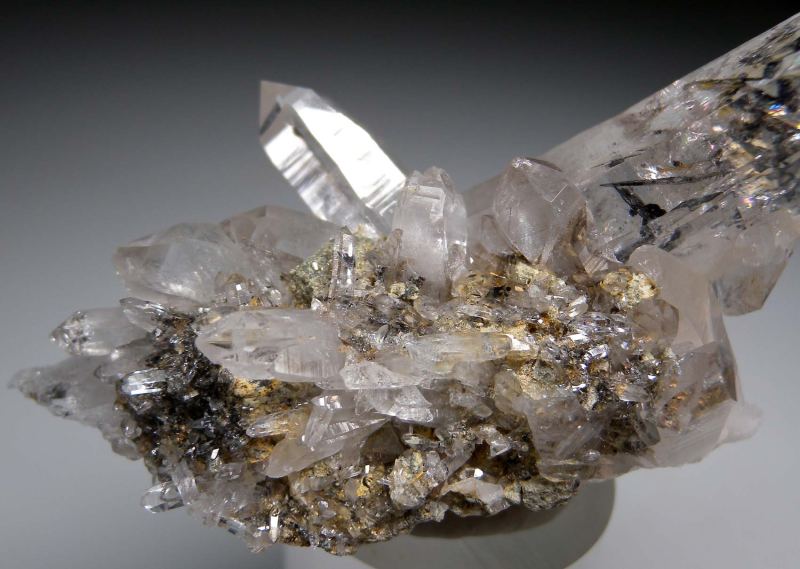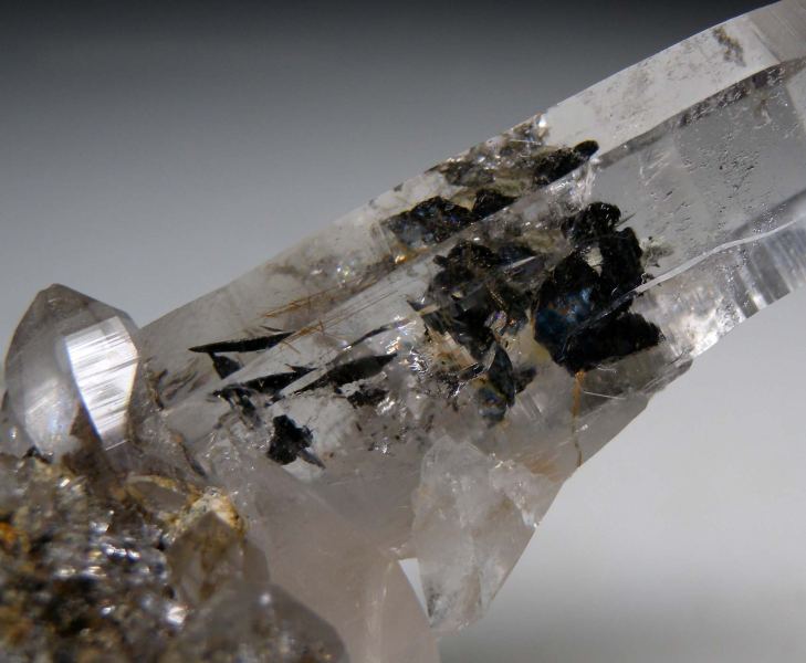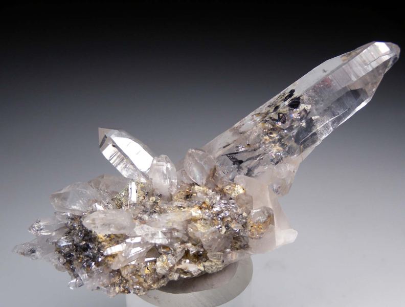 Cluster of glassy, transparent Quartz crystals from the White Mountains. The largest crystal is 7cm, doubly-terminated, and has a platy black Hematite crystals included inside.Data last checked on 10th Mar 2026