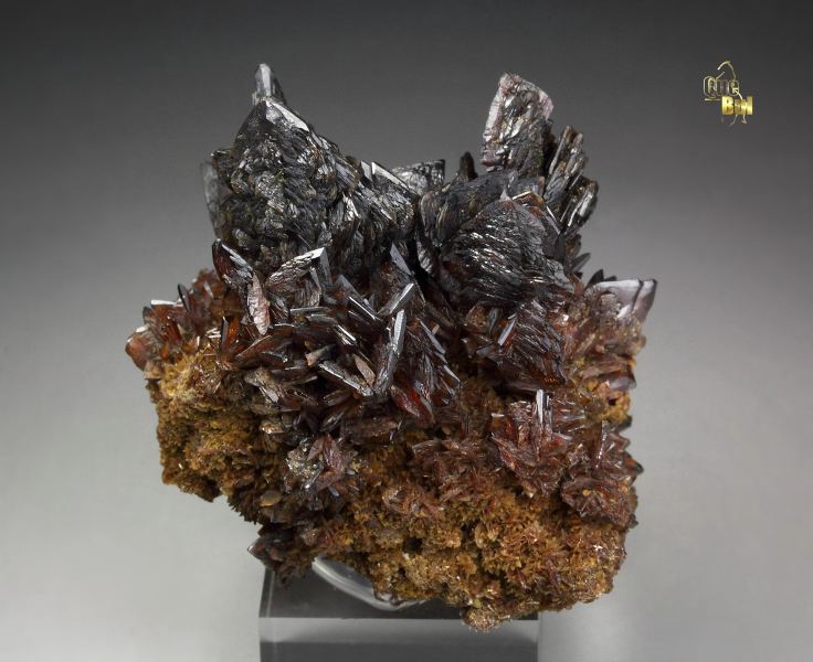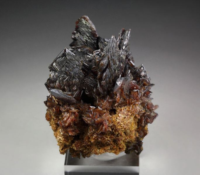 A fine quality specimen of descloizite from Berg Aukas, Namibia, which has produced the world’s best specimens for the species. It comes from the collection of Glen Kisselman, USA - with label. It displays crystals forming attractive towers of consecutively growing parallel flattened blades and spears. They are waxy lustrous and light reflective. The color is brown-red. At the base the crystals are brighter and translucent. It shows aesthetically all over 360 degree. In very good condition - some small damages. On acrylic base., Superb descloizite!, Data last checked on 10th Mar 2026