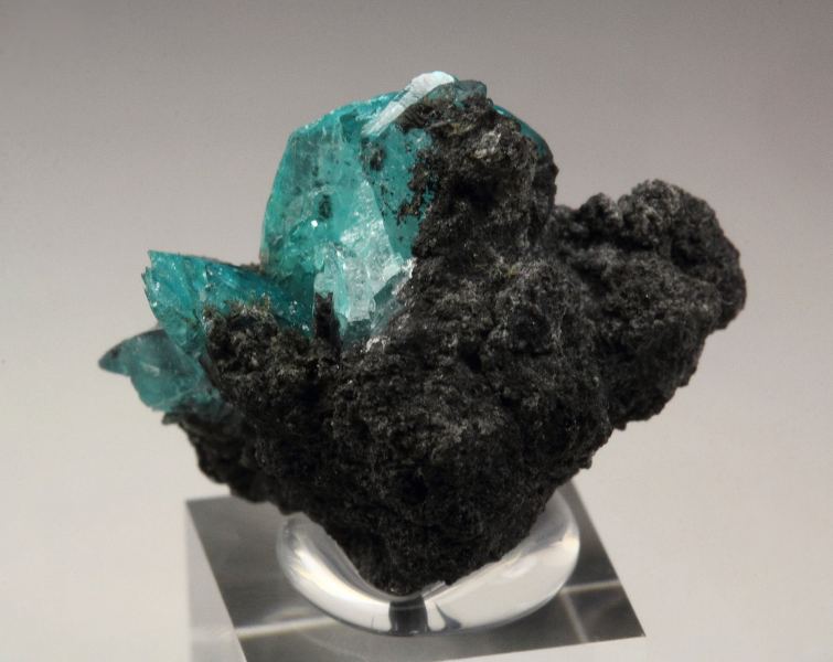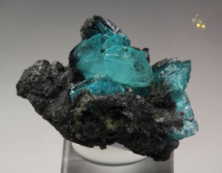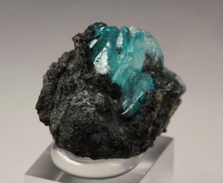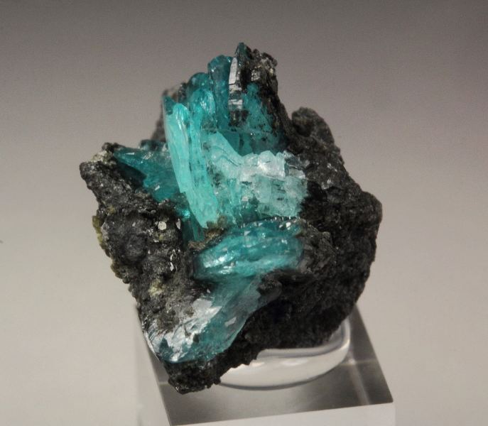 A top quality thumbnail specimen of gem borcarite crystals from a superb recent find in San Bartolo Mine, Charcas, Mexico. Borcarite is a rare calcium magnesium borate and these are among the finest borcarite crystals in the world. It displays well formed and sharp tabular crystals up to 7mm. They are from translucent to transparent and gem. They are strongly lustrous. The most amazing aspect is the rich bright turquoise-blue color, which is more saturated that the most of the crystals from the find. In excellent condition – back side contact. On acrylic base., Exceptional!, Data last checked on 10th Mar 2026
