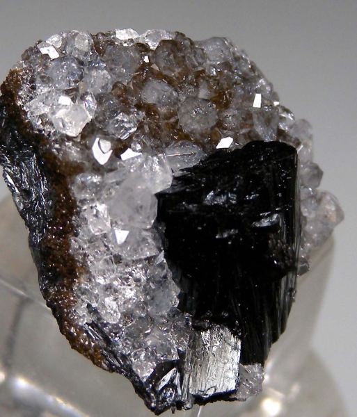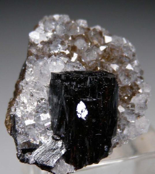 Isolated 1.2cm single Manganite crystal on a Quartz crystal coated matrix. Usually found in dense groups, finding an isolated crystal on matrix is uncommon. Ex. Marty Zinn collection.Data last checked on 16th Mar 2026