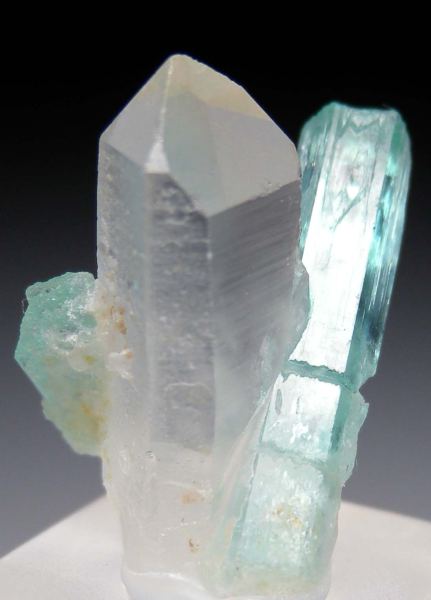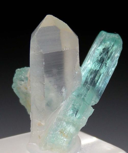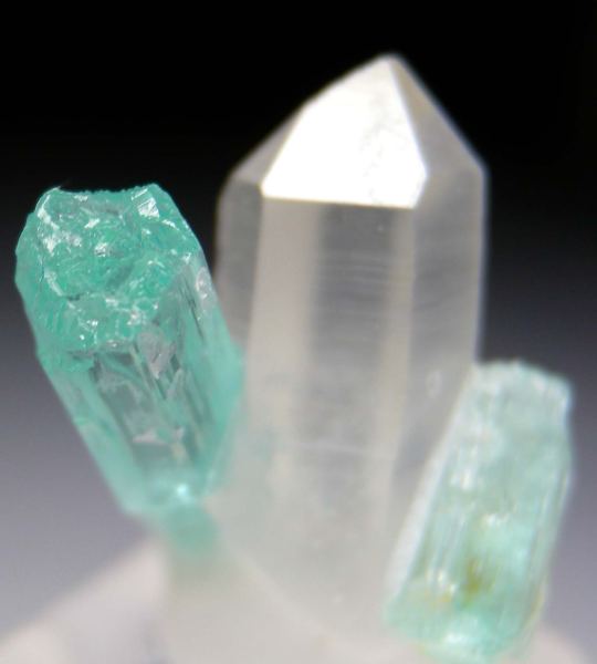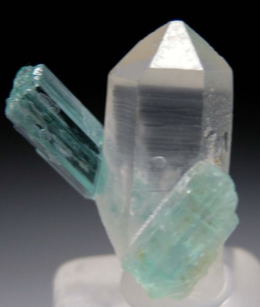 Transparent Emerald crystals on a single well terminated clear Quartz crystal. The larger Emerald is 2.2cm long, transparent and partially etched with a partially etched termination.Data last checked on 18th Mar 2026 - specimen may no longer be available