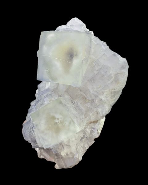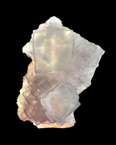 Complex fluorite specimen in the so-called “Dragon Eye” style. This fluorite initially crystallized as octahedra; later, a change in growth conditions led to cubic crystals growing syntactically on the earlier forms. When backlit, reveal darker cross at the center of the crystal. Specimen from recent mining activity.;Read more about “Dragon Eye” fluorites in our article HERE.Data last checked on 19th Mar 2026 - specimen may no longer be available