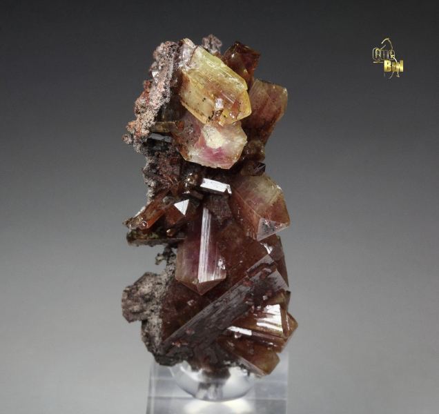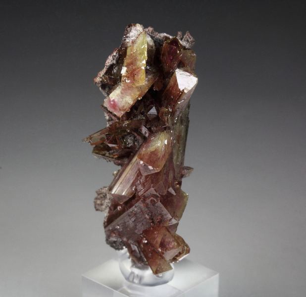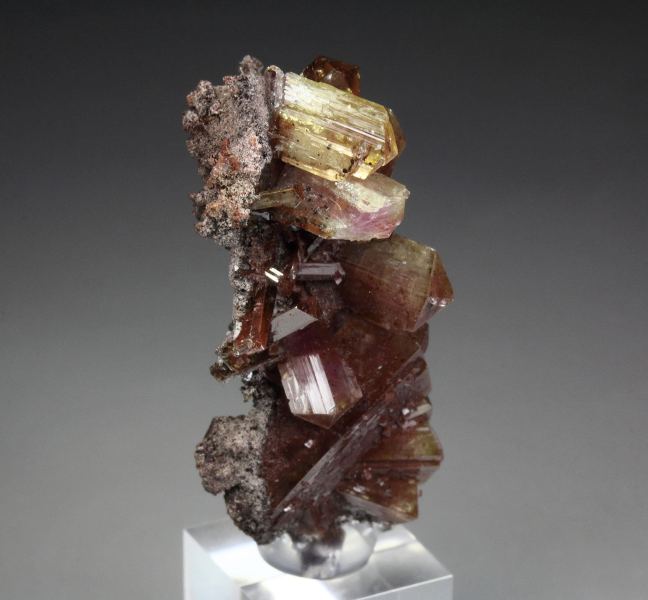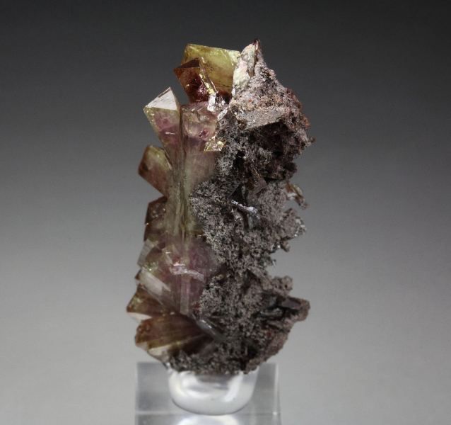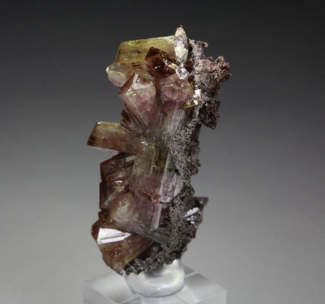 A gorgeous specimen of rich yellow to purple and gemmy adamite var. manganoan adamite crystals from the legendary Ojuela Mine, Mexico. It displays sharp adamite crystals with an orthorhombic shape. They have gorgeous and saturated purple color to yellow. The crystals have a superb luster and strong glassy appearance. At the lower part the crystals have dark red hematite inclusions. In very good condition – some small contacts. On acrylic base., Mesmerizing!, Data last checked on 19th Mar 2026 - specimen may no longer be available