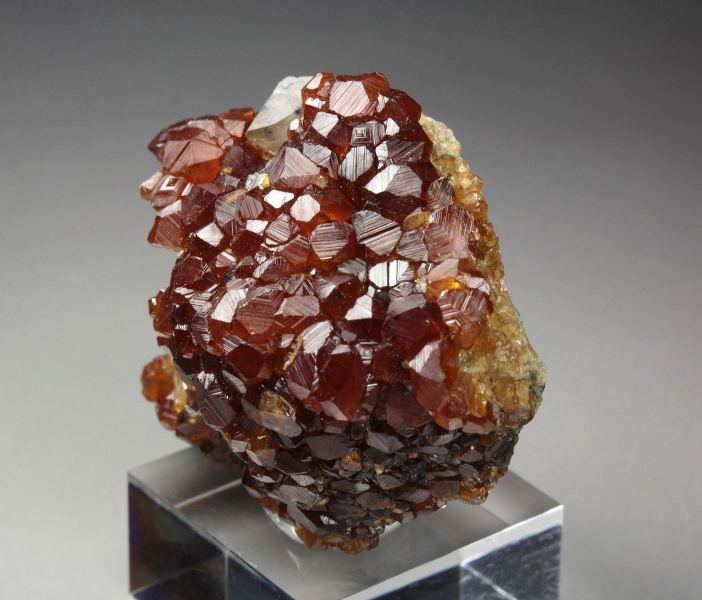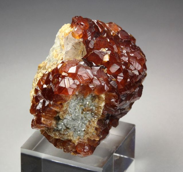 A pleasing specimen of gemmy spessartine garnet crystals up to 3mm densely covering the base from Tongbei, Fujian Province, China. The crystals are well shaped with rich orange-red color. The luster is waxy and the faces are sparkling. Some contacts. On acrylic base., Marvelous!, Data last checked on 19th Mar 2026 - specimen may no longer be available
