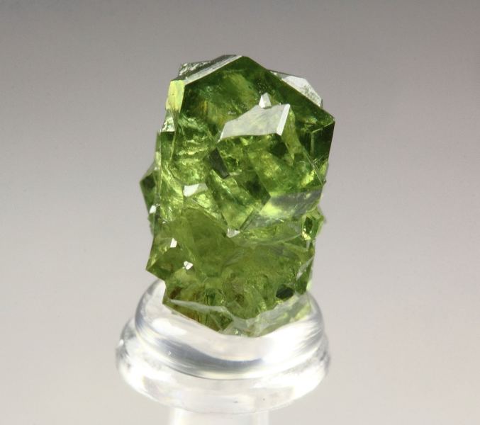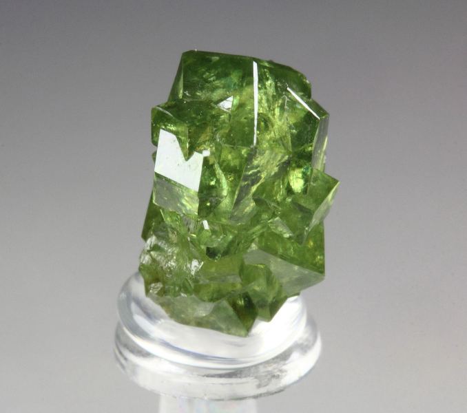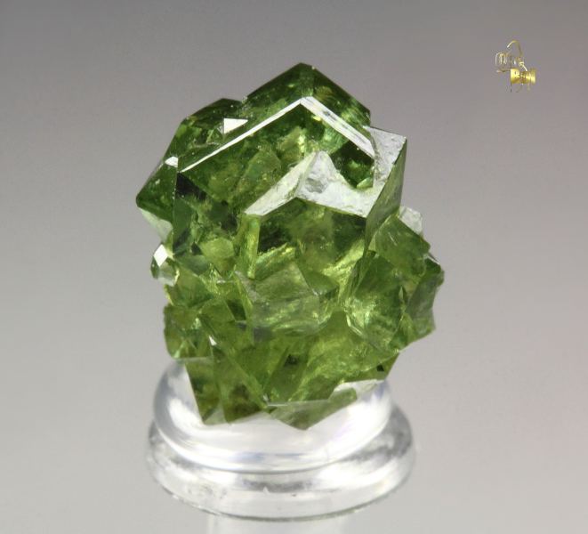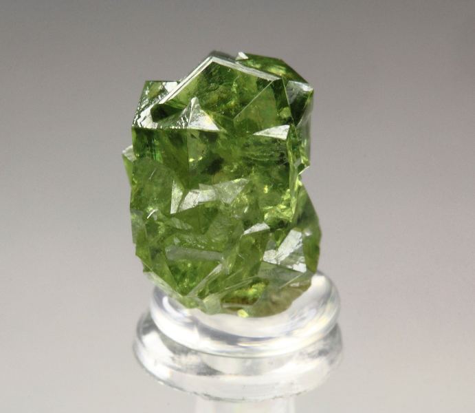 Killer gem crystals of garnet var. andradite var. demantoid from the famous Malenco Valley, Italy. They have sharp rhombic dodecahedral habit. The crystals are glassy lustrous and light reflective. They are transparent, clear and gem – much better than most of the garnets from the locality. The color is pleasing and rich apple-green. It is complete all over floater. It shows beautifully from all sides. In excellent condition. On acrylic base., Stunning!Data last checked on 21st Mar 2026
