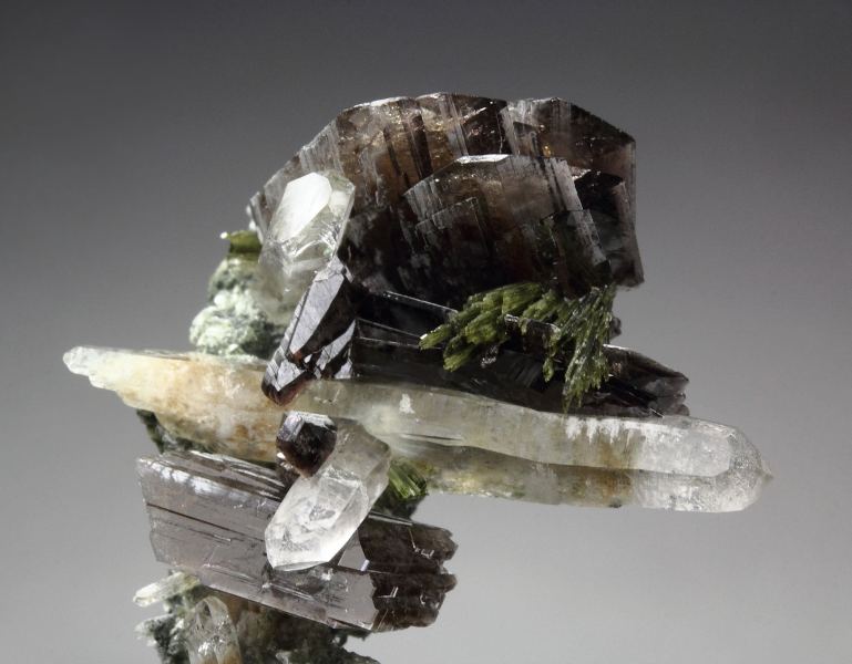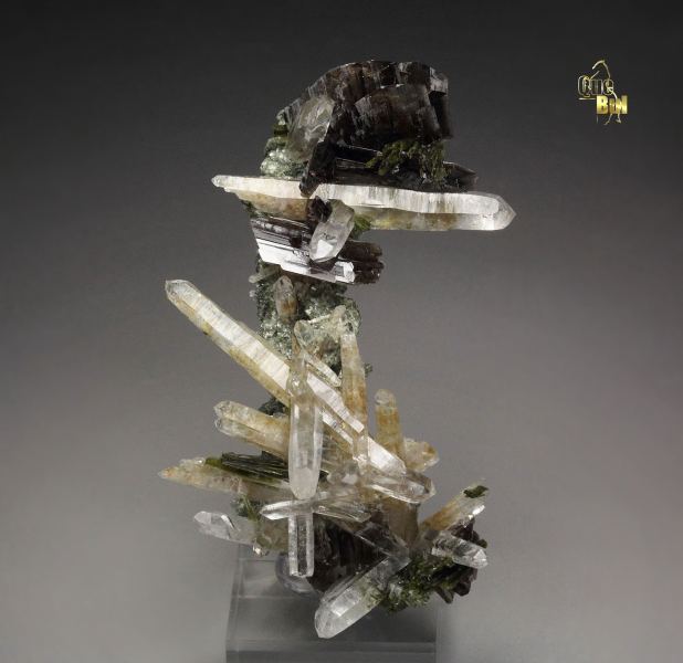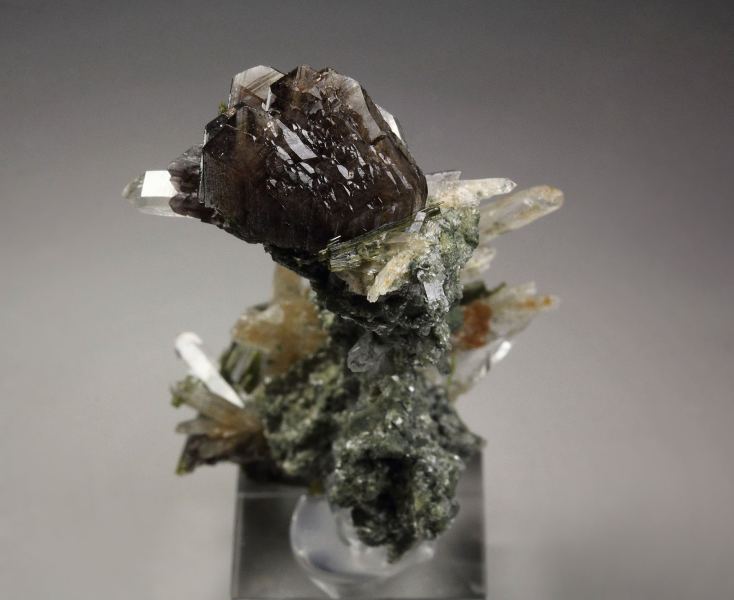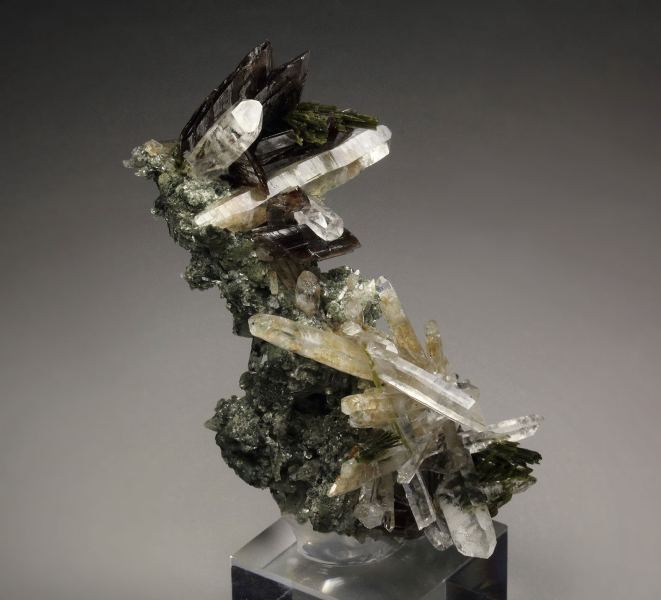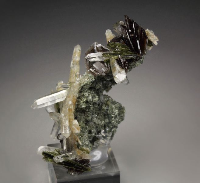 A fabulous specimen of axinite-Fe, quartz, epidote and clinochlore from Canta District, Peru. On a green, sparkling clinochlore base grow quartz crystals in a sculptural cluster. They are transparent, water clear sharp and lustrous. Many are doubly terminated. The epidote grows in sprays of needle crystals. They have rich olive-green color and pearly luster. Many epidote needles are included in the quartz. The axinite-Fe crystals are sharp,, transparent, with brown color and strong luster. In excellent condition – some minor damages. On acrylic base., Astonishing combo!, Data last checked on 21st Mar 2026