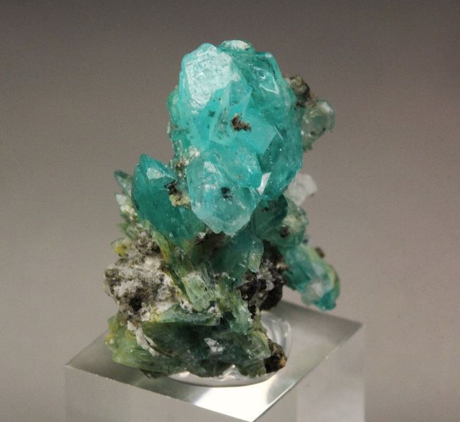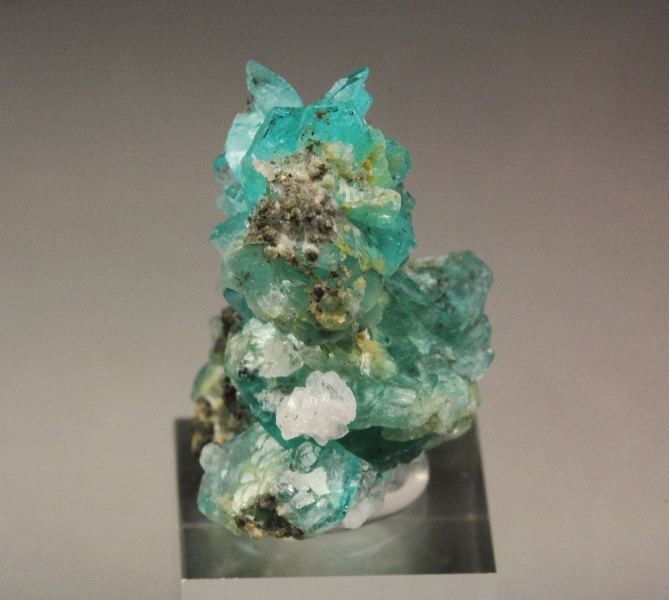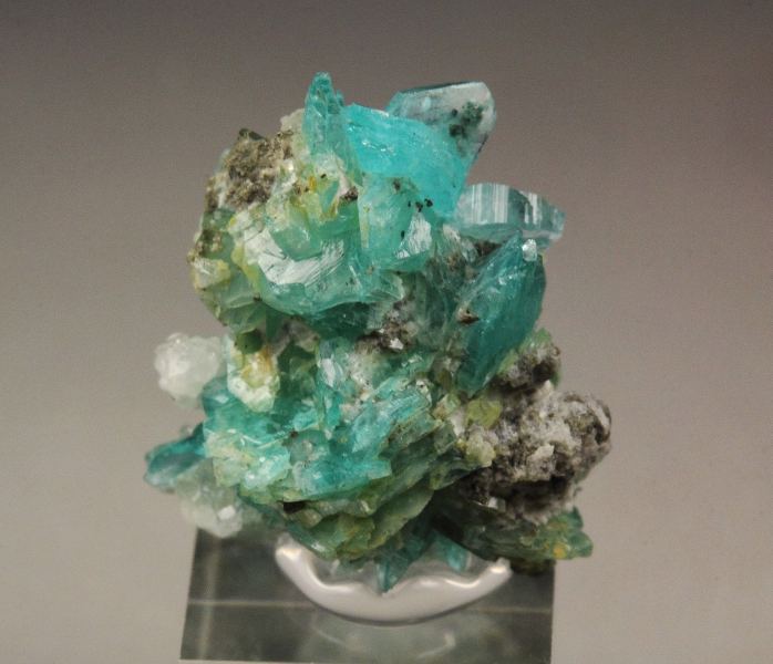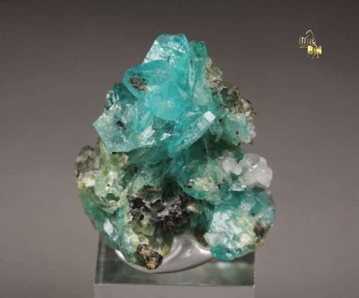 A fine quality thumbnail specimen of gemmy borcarite crystals from a superb recent find in San Bartolo Mine, Charcas, Mexico. Borcarite is a rare calcium magnesium borate and these are among the finest borcarite crystals in the world. It displays well formed and sharp tabular crystals. They are from translucent to transparent. They are strongly lustrous. The most amazing aspect is the bright blue color. Some other unidentified minerals are seen too. In very good condition – some natural imperfections. On acrylic base., Exceptional!, Data last checked on 23rd Mar 2026