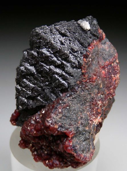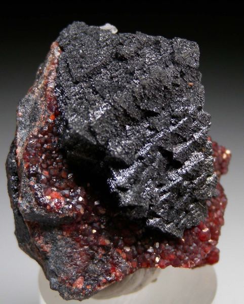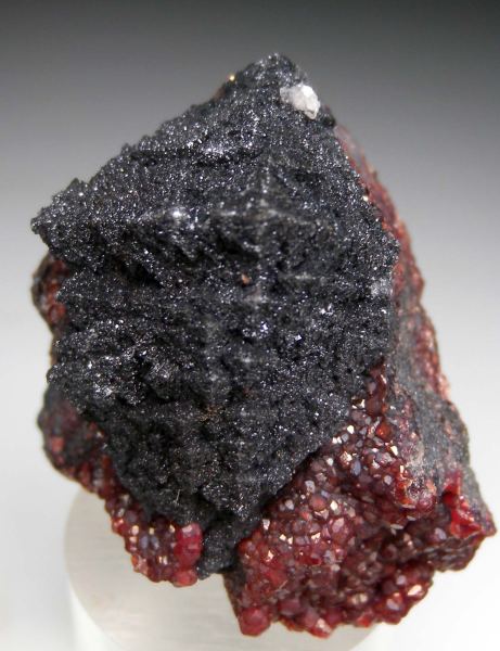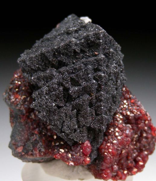 Shimmering black cluster of Hausmannite, 4cm tall, on red Andradite crystals. Ex. Georg Gebhard collection.Data last checked on 24th Mar 2026