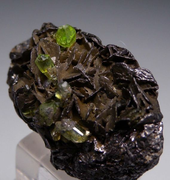 Bright green, gemmy Diopside crystals on platy crystals of Graphite. Likely from the 2007 pocket that produced ikonic specimens of this combination.Data last checked on 24th Mar 2026