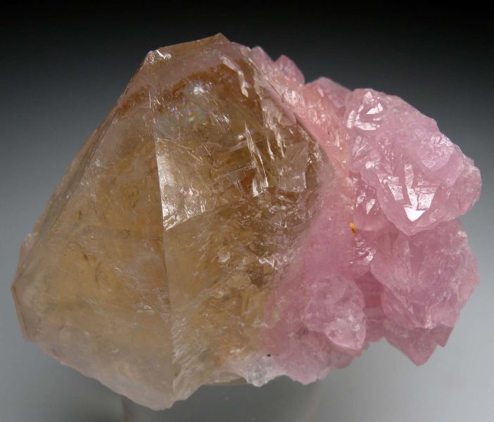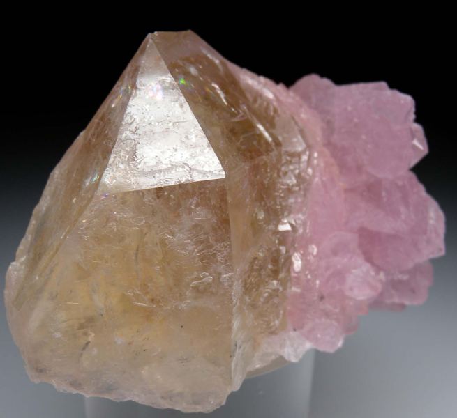 Stout, single light smokey/citrine Quartz crystal adorned with bright pink Rose Quartz. Fine example with beautiful color contrast.Data last checked on 24th Mar 2026