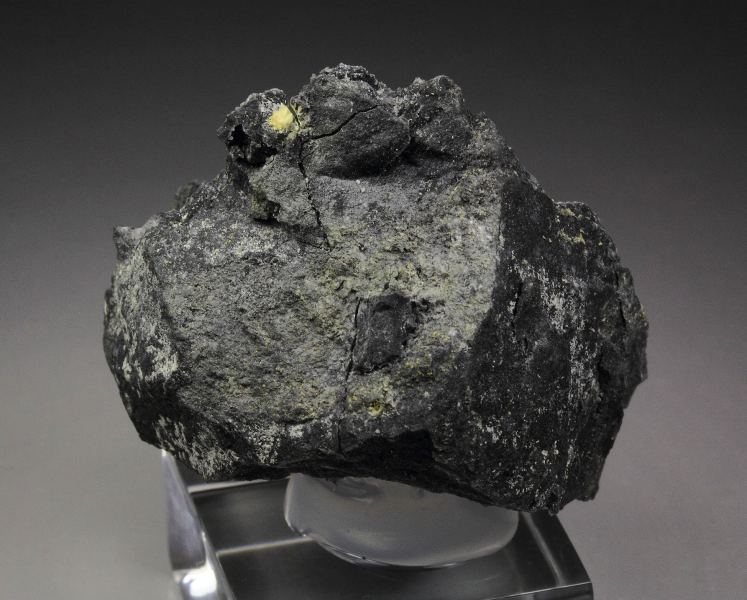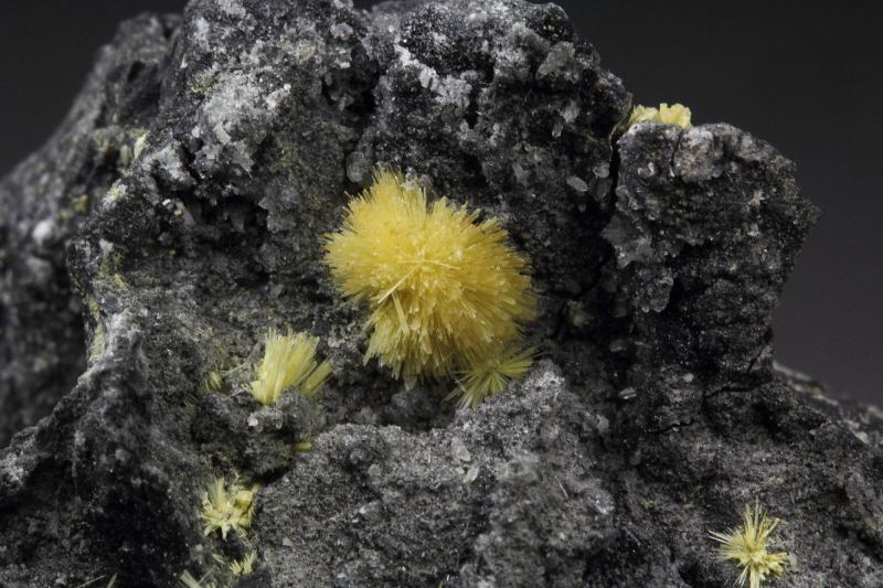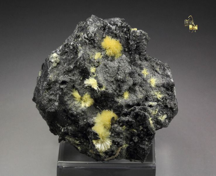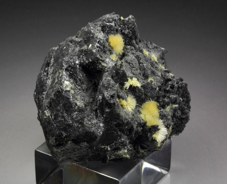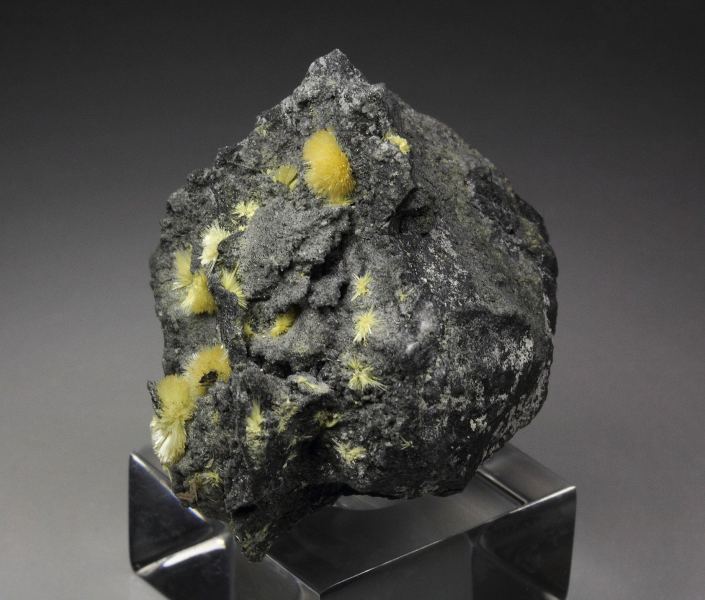 A wonderful specimen of rare valentinite from Xikuangshan Sb deposit, Hunan, China. Valentinite is an uncommon Sb-oxide. It displays awesome tufts of yellow, acicular crystals of valentinite beautifully growing at the top of the matrix. It forms radial sprays with sparkling luster. In excellent condition. On acrylic base., Fantastic valentinite!, Data last checked on 27th Mar 2026