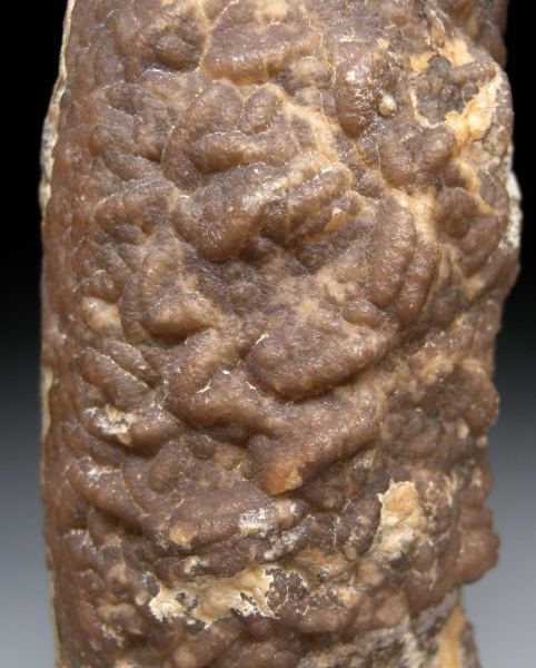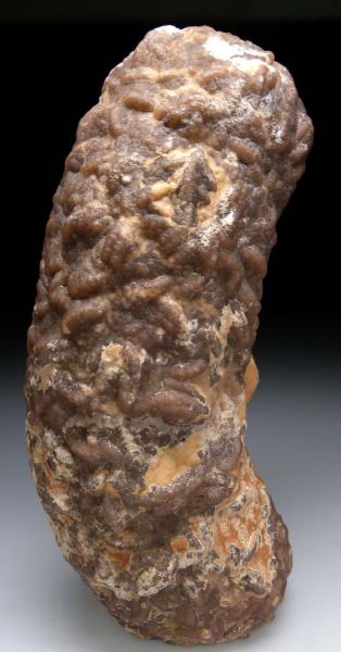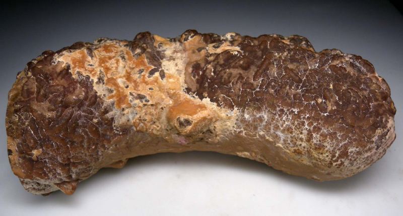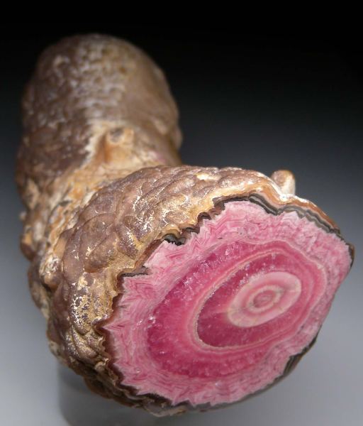Large single stalactite of Rhodochrosite polished on the cut end. Big and heavy specimen with a smooth exterior on one half and crystals covering the other half. Ex. John Dabney collection.Data last checked on 1st Apr 2026