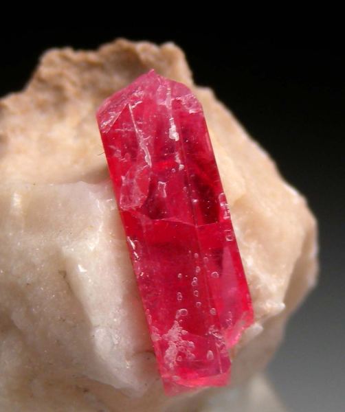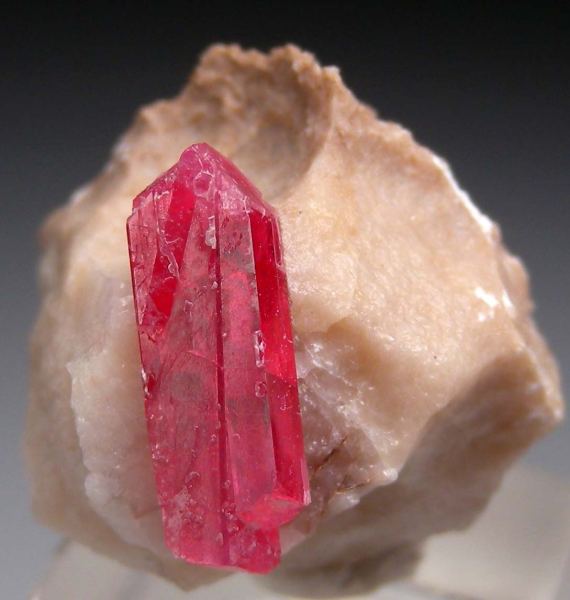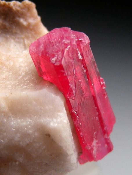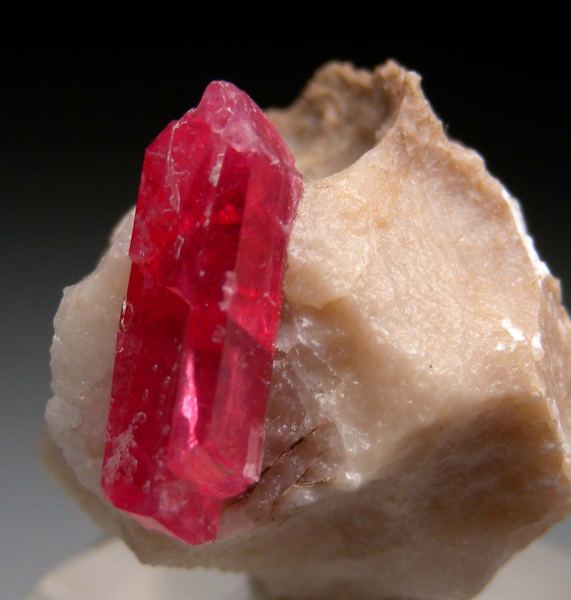 Single gem crystal of Rhodonite on Calcite from recent finds in Brazil. This is an undamaged, complete 1.4cm crystal on matrix, which is uncommon as they are usually loose single crystals. Most of these have irregular, stepped terminations - this one has nice flat termination faces. Superb color.Data last checked on 1st Apr 2026