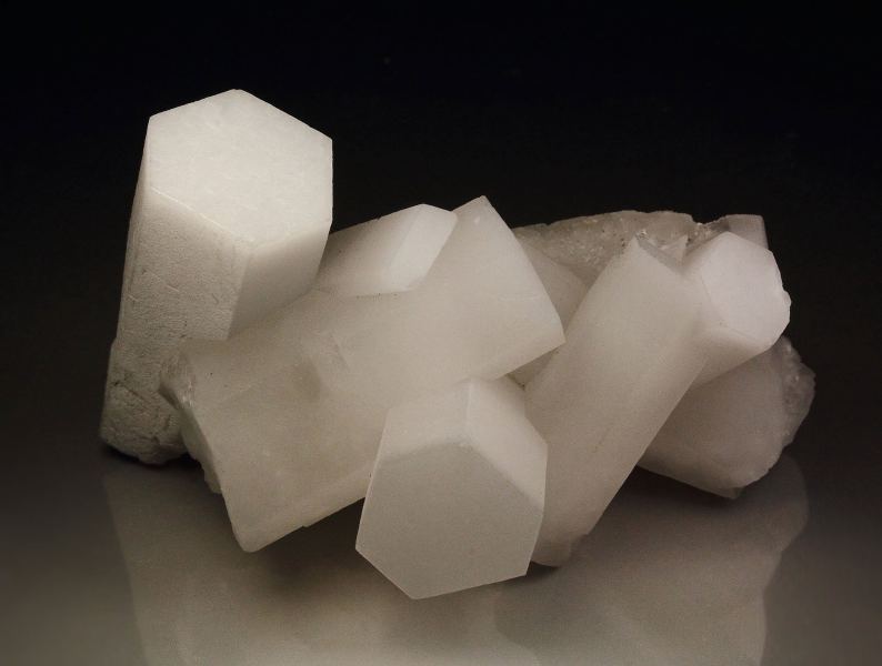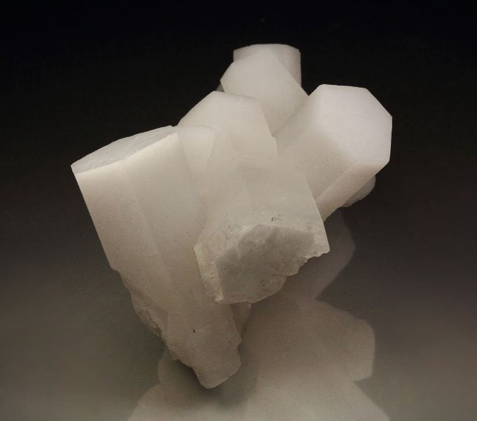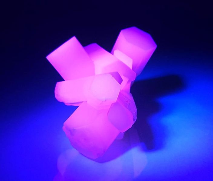 A superb calcite specimen with attractive display from Wuyi County, Zhejiang, China. The hexagonal prismatic crystals are perfect and razor sharp. They are porcelain white and grow in a sculptural cluster. They are strikingly fluorescent in rich pink. In very good condition – one base part contacts., Magnificent!, Data last checked on 2nd Apr 2026