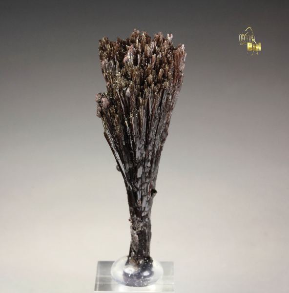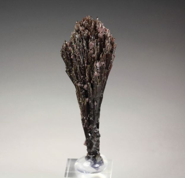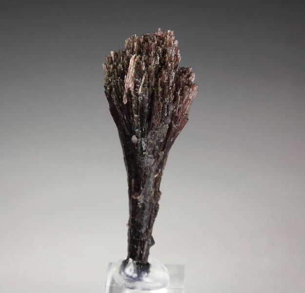 An exquisite spray of red-brown uvite crystals with minor goethite from Pomba pit, Bahia, Brazil. It displays long uvite needle crystals, forming a delicate fan spray with beautiful stand from all sides. The crystals have sparkling luster. Very small goethite spheres grow above. In very good condition. On acrylic base., Superb!, Data last checked on 8th Apr 2026
