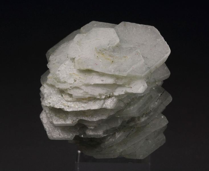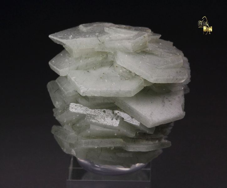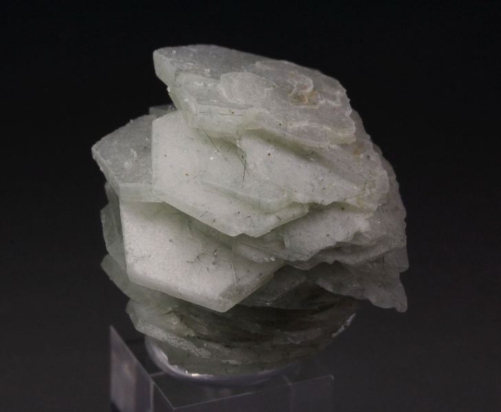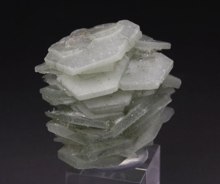 A cool specimen of actinolite needles included in calcite crystals from Huanggang Fe-Sn deposit, Inner Mongolia, China. It displays sharp, hexagonal tabular calcite crystals growing one atop another in neat structure. The calcite crystals are lustrous and colorless. Green actinolite needles add a hue. It shows attractively all over 360 degree. In very good condition - some small contacts. On acrylic base., Neat!, Data last checked on 10th Apr 2026 - specimen may no longer be available