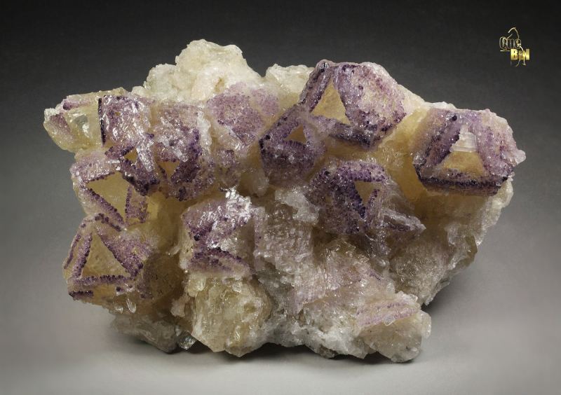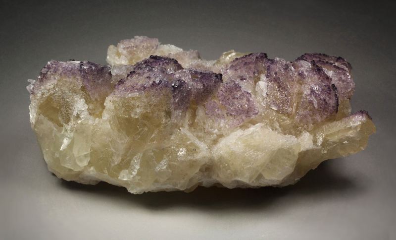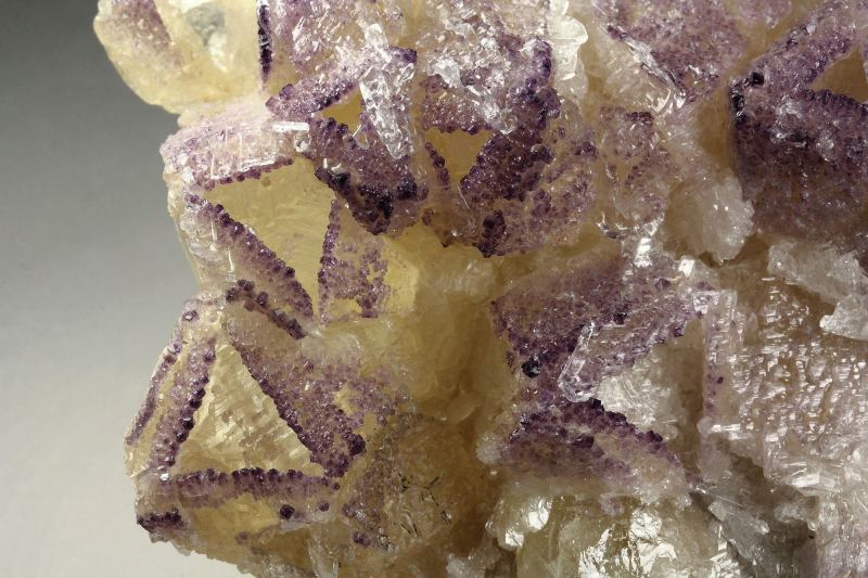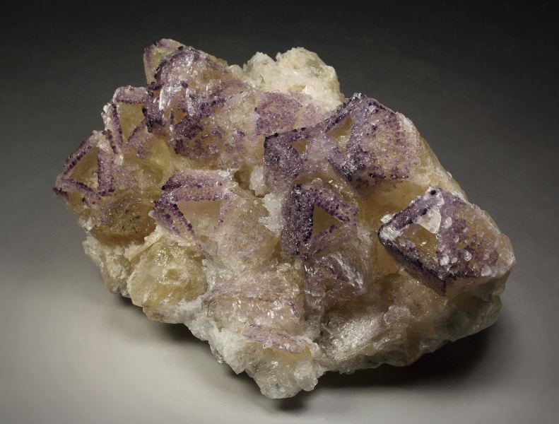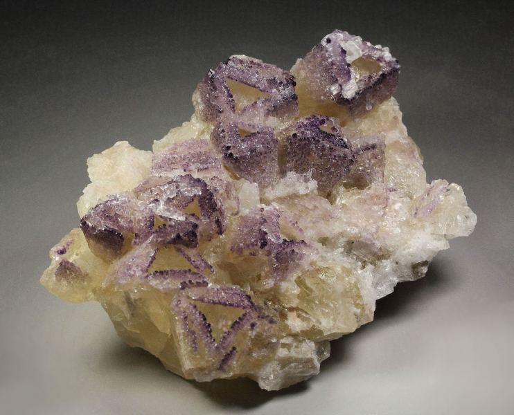 An outstanding specimen of fluorite incrustations on skeletal calcite with gypsum from Huanggang Fe-Sn deposit, Inner Mongolia, China. It comes from a new find. It displays cream colored tetrahedral calcite crystals with complex faces that form attractive hollow and cavernous structures. On the rims of the skeletal structure grow dark purple fluorite crystals. They are small cubic crystals with rich color. They outline the skeletal features. Colorless gypsum crystals grow on the calcite. Calcite is fluorescent with pinkish hue. In very good condition – some outside edge contacts., Stunning!, Data last checked on 10th Apr 2026 - specimen may no longer be available