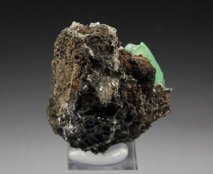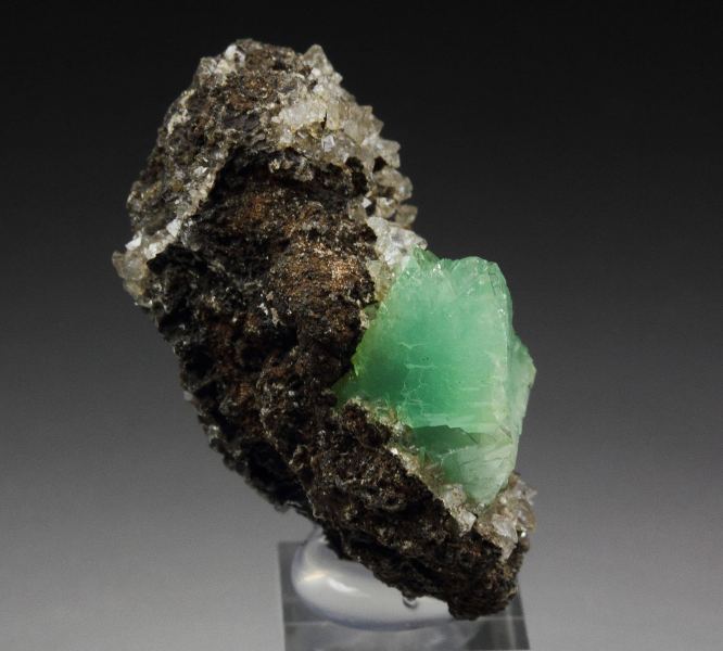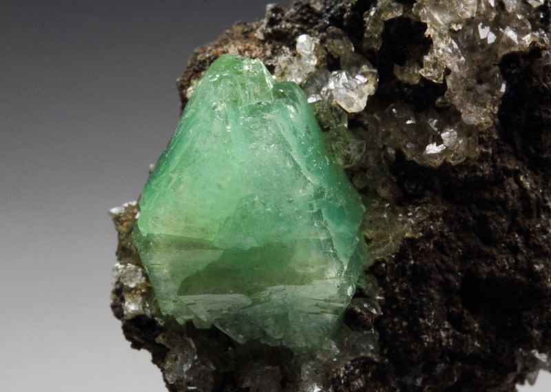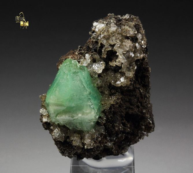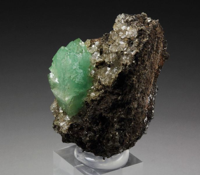 A fantastic adamite var. cuprian crystal with transparent colorless calcite from the famous Ojuela Mine, Mapimi, Mexico. The adamite crystal is 13mm, very well shaped and sharp. It is gemmy with a mint-green color and strong sparkling luster. The crystal has a fresh appearance. The colorless calcite and the dark base give a strong contrast, and the adamite pops out. Rare cuprian adamite from this great mine. In excellent condition. On acrylic base., Mesmerizing!, Data last checked on 12th Apr 2026
