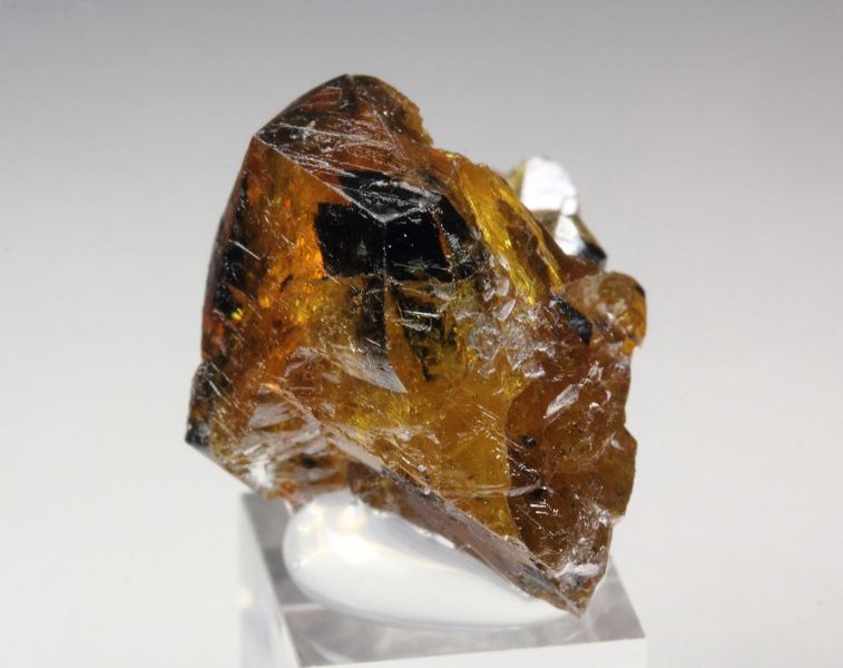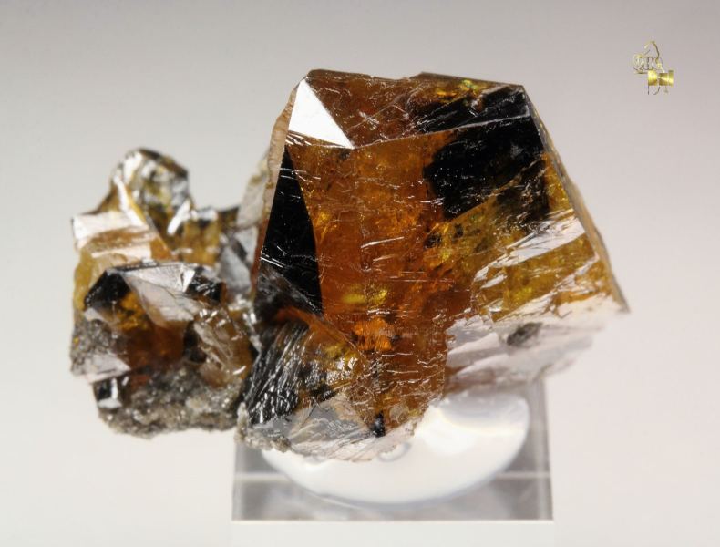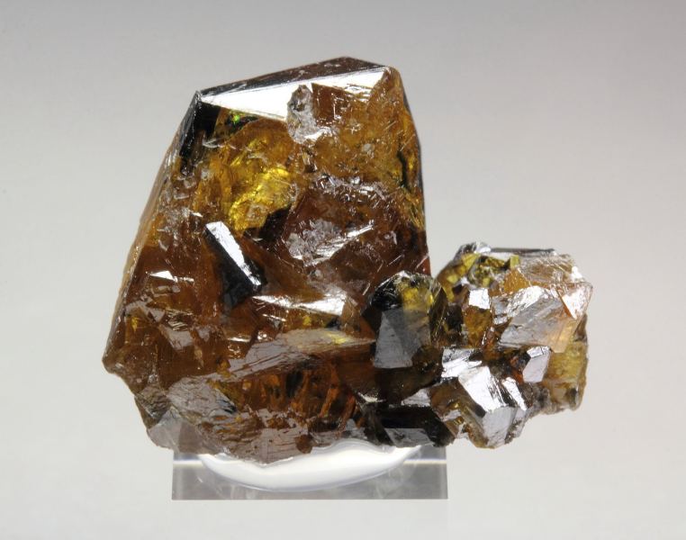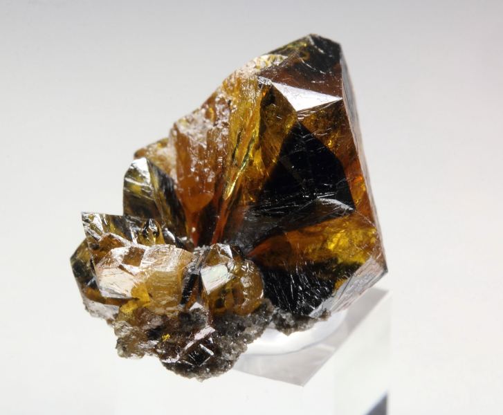 A high quality specimen of gem sphalerite crystals from Walworth Quarry, New York, United States. It comes from the collection of the famous mineral painter Frederick C. Wilda, USA - with label. The crystals are transparent, gem and highly waxy-lustrous with rich honey color. They are well crystallized with attractive black phantoms due to inclusions. In good condition – some contacts. On acrylic base., Fascinating!, Data last checked on 16th Apr 2026