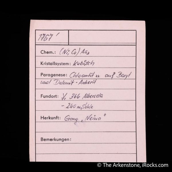 This is a Nickelskutterudite with Dolomite and Baryte from Shaft 366, Alberoda, Aue-Bad Schlema, Erzgebirgskreis, Saxony, Germany. A rich, and very attractive display quality specimen of nickelskutterudite (formerly known as chloanthite) from Niederschlema area in the Erzgebirge region of Germany.Data last checked on 17th Apr 2026 - specimen may no longer be available