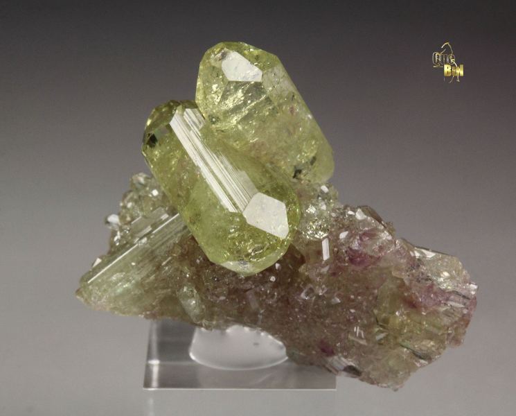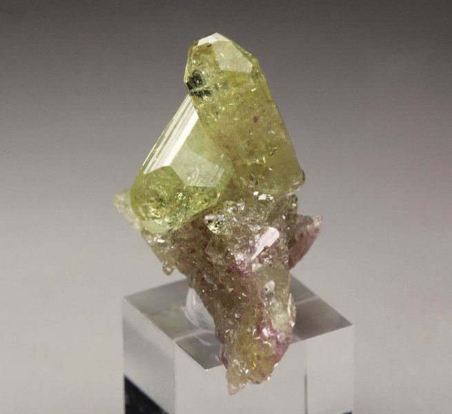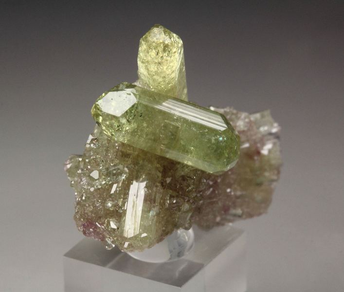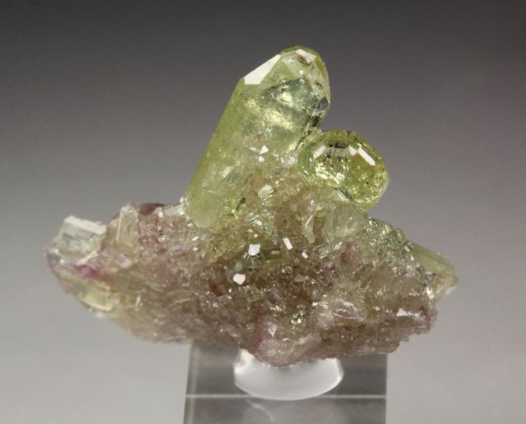 A beautiful specimen of gem vesuvianite crystals from the renowned Jeffrey mine, Quebec, Canada. The sharp prismatic crystals are transparent with a bright apple-green color. The main crystals are doubly terminated and they form an aesthetic focal point at the top. At the base is seen purple. The luster is very strong and the faces are glassy. The specimen displays all over 360 degree. For references see the 2013 issue of The Mineralogical Record vol. 44, # 4. In excellent condition. On acrylic base., Gorgeous!, Data last checked on 18th Apr 2026 - specimen may no longer be available