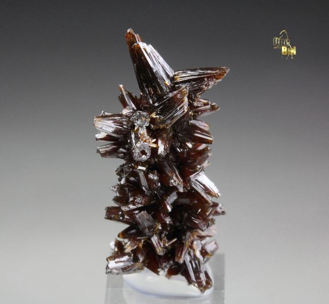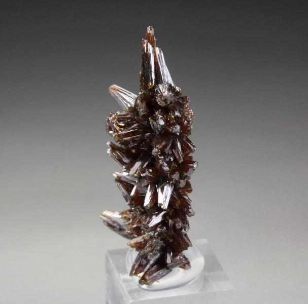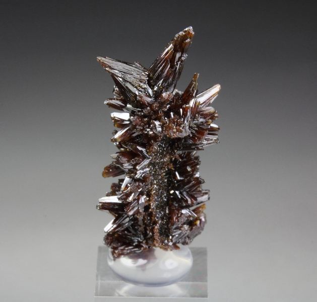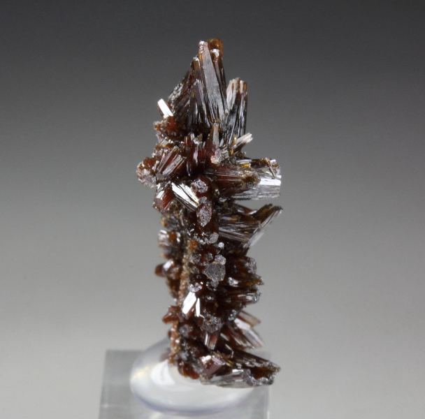 Superb and rarer now vanadinite var. arsenatian vanadinite with distinctive and uncommon appearance from Erupcion Mine, Los Lamentos Mts, Mexico. Arsenatian vanadinite was called endlichite and was considered a species before, but is now considered as an arsenic-bearing variety of vanadinite. It displays an attractive cluster of waxy brown crystals. They are very lustrous and light reflective needle crystals. Some damaged crystals. On acrylic base., Marvelous!, Data last checked on 20th Apr 2026