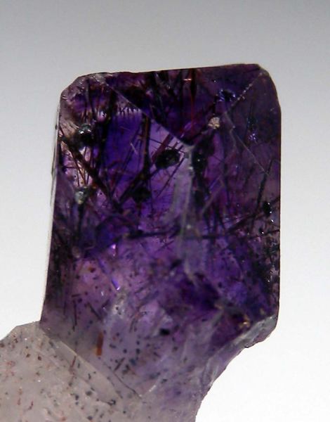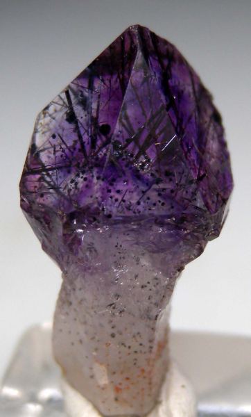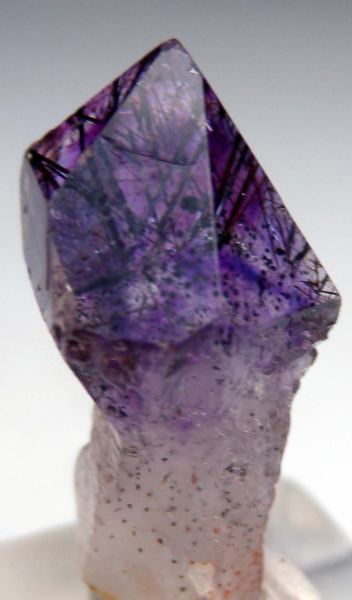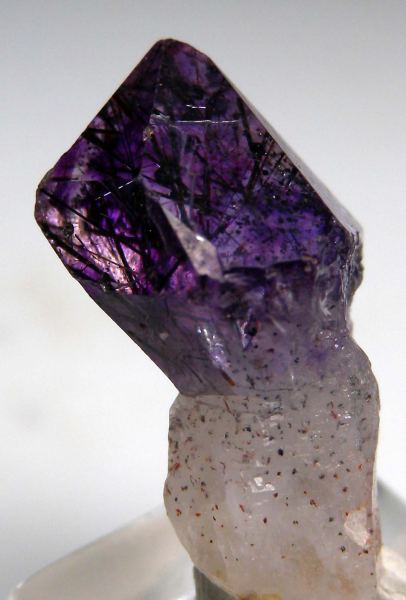 Glassy, transparent Amethyst scepter atop a white Quartz stalk. Complete all around with dark needle-like inclusions. The Amethyst is somewhat pseudocubic in form and appears rectangular at certain angles.Data last checked on 21st Apr 2026
