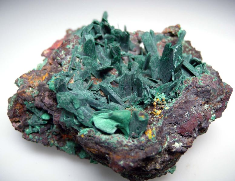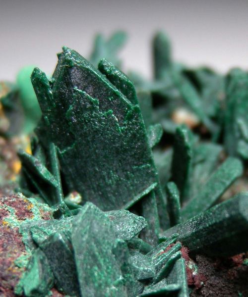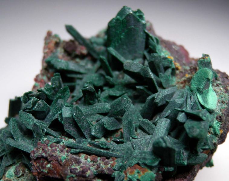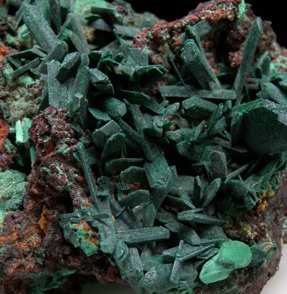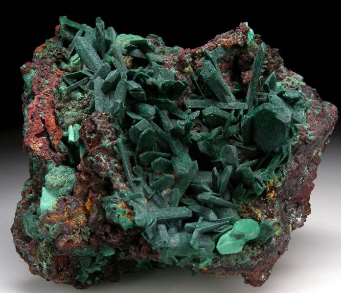 Sharply formed crystals of Malachite pseudomorphs after Azurite covering top surface of matrix. Loads of fine undamaged crystals acrosss the top, along with areas of non-pseudomorphic Malachite. More Malachite in vugs on other side too. Ex. John V. Mitchell collection dating back to the 1920s.Data last checked on 21st Apr 2026