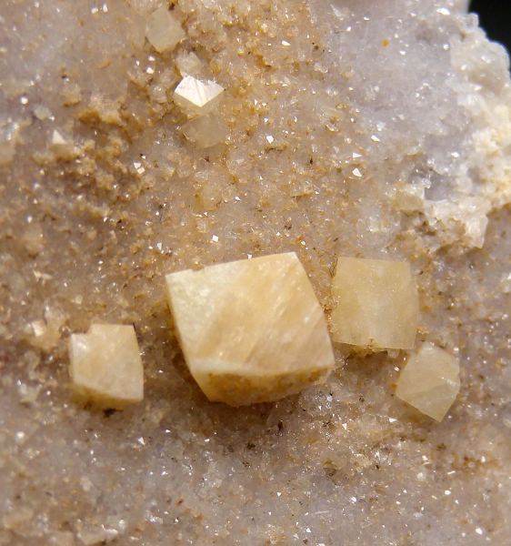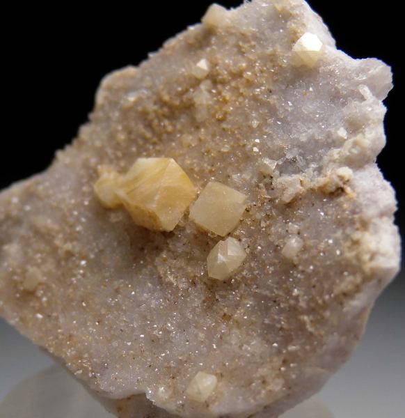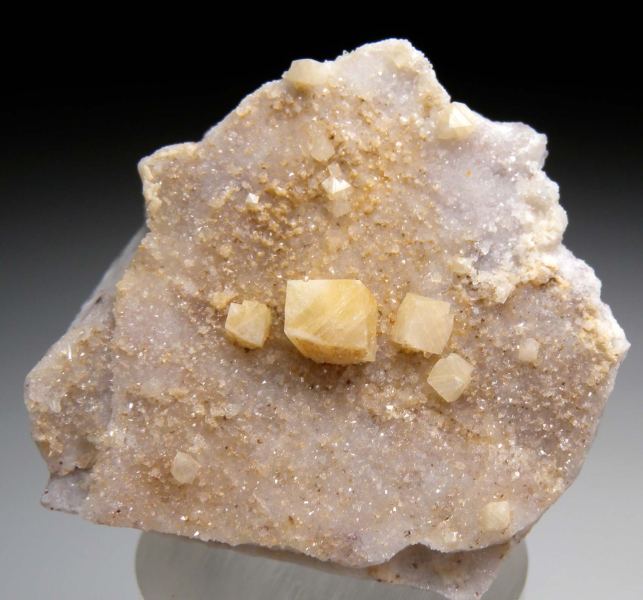 Well isolated Woodhouseite crystals to 8mm on a flat matrix face coated by small Quartz crystals. There are four main undamaged crystals well centered on the Quartz, with additional small crystals on the edges. The Champion Mine is the Type locality for this rare species and has produced the world's best specimens.Data last checked on 21st Apr 2026