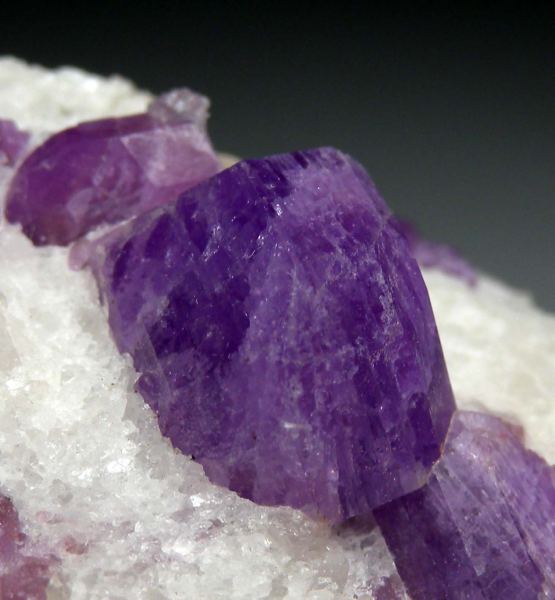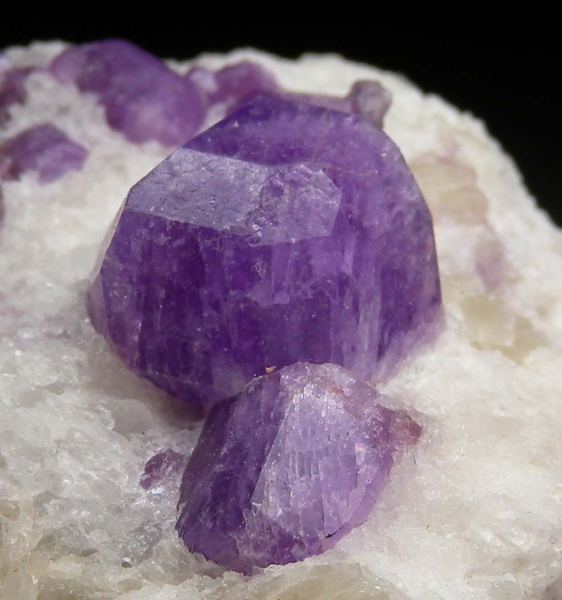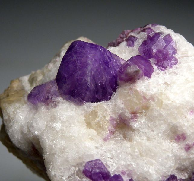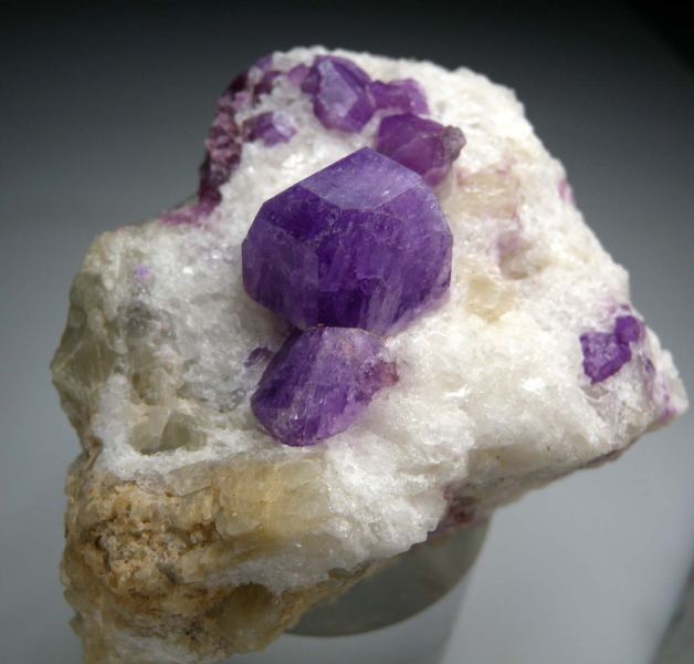 Vivid purple crystals of Hackmanite to 1.8cm in size on matrix with Fluorichterite. The crystals on this specimen are exceptional in many ways. First, the color is a saturated purple compared to most which are pale blue or pale purple. The crystals also have sharp edges and luster - so many have more worn looking or rounded edges. The main crystal is also very 3 dimensional sticking up off the matrix with crystal faces all around. A superb Hackmanite with undamaged crystals. Ex. Carl Acosta, Paul Stahl collections.Data last checked on 21st Apr 2026