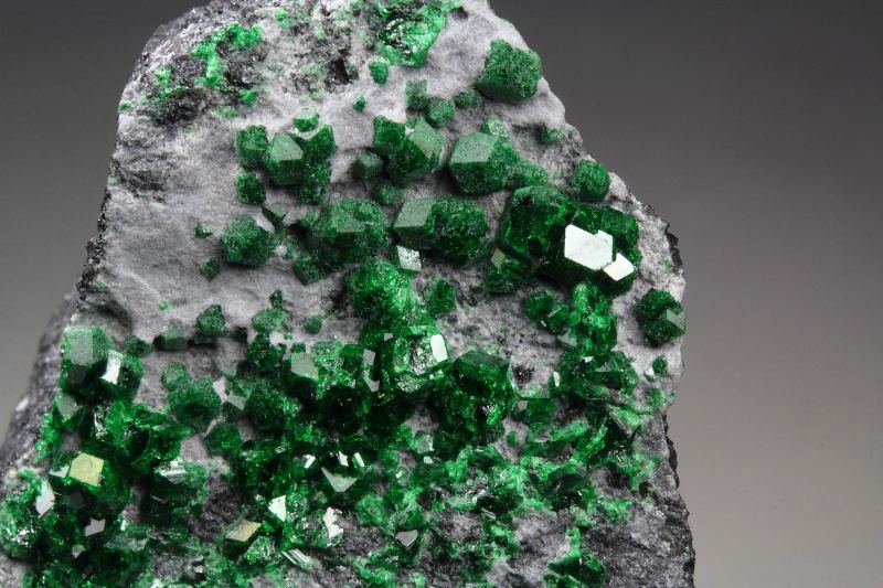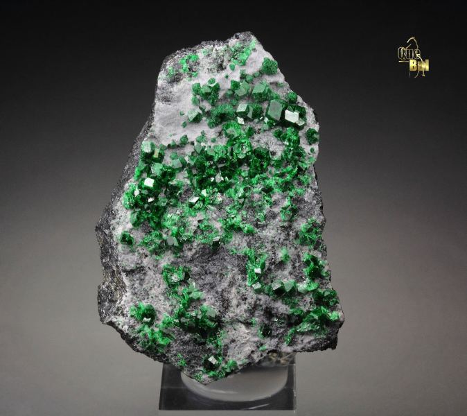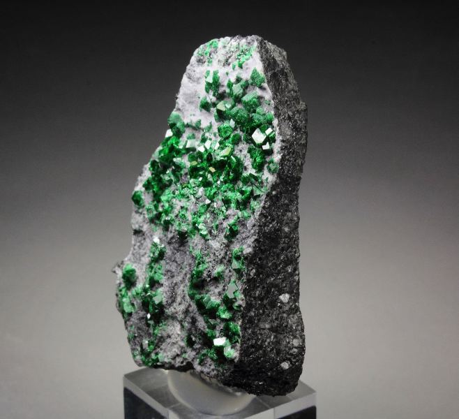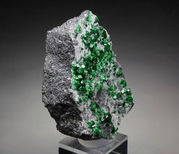 A cool specimen of garnet var. uvarovite from the renowned Saranovskii Mine, Russia, showcasing crystals up to 2mm in size. Uvarovite, a rare and prized variety of garnet, owes its rich green color to the presence of chromium. The deep, intense grass-green uvarovite crystals are sharply formed in a rhombic dodecahedral habit. Their remarkable luster and sparkling brilliance enhance the overall aesthetic, making the green crystals pop out. The bottom of the piece is sawed. Some contacts. On acrylic base., Marvelous!, Data last checked on 27th Apr 2026
