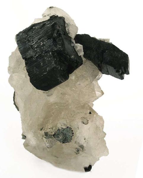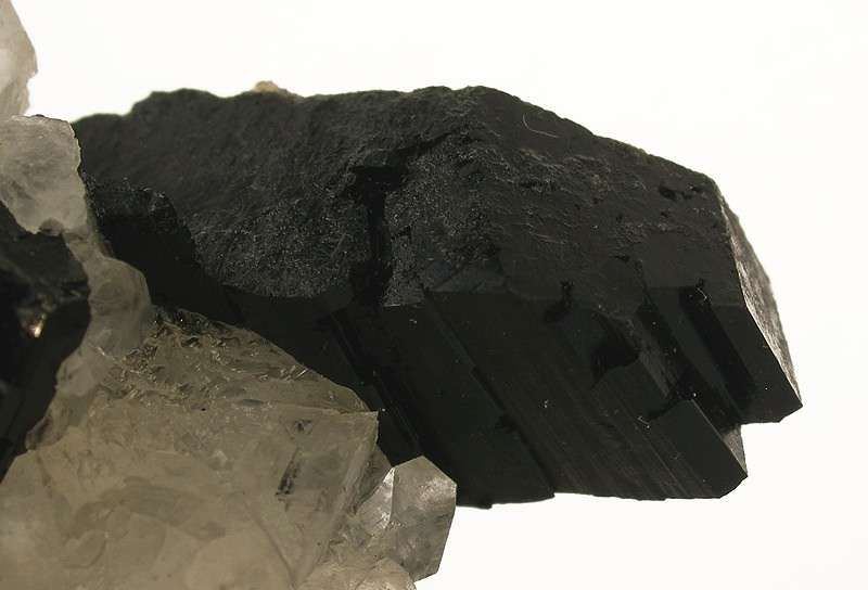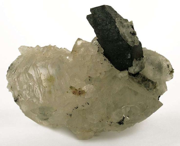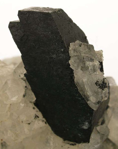 This is a Babingtonite on Calcite from Hongquizhen Quarry, Meigu Co., Liangshan, Sichuan Province, China. Lustrous and translucent, colorless crystals of calcite to 3 cm across form an agglomerated and very bizarre matrix for a single rather large crystal of jet-black babingtonite, 3.7 cm in length!Data last checked on 18th Jan 2026 - specimen may no longer be available