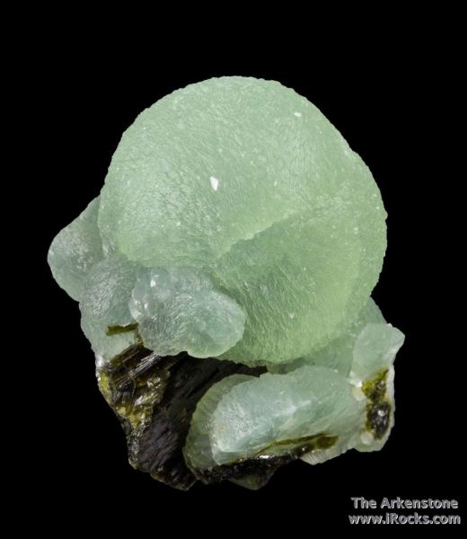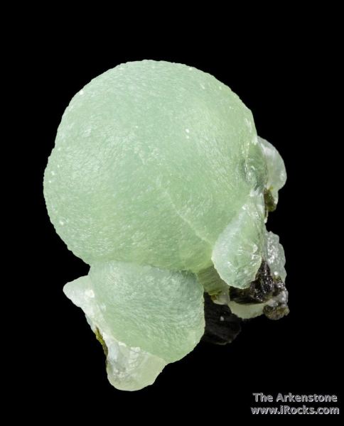 This is a Prehnite on Epidote from Diakon, Cercle de Boufalabe, Kayes Region, Mali. An elegant miniature topped off by a 3 cm across, botryoid of lustrous and translucent, apple green prehnite.Data last checked on 28th Jan 2026 - specimen may no longer be available