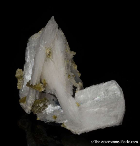 This is a Bertrandite from Golconda Mine, Governador Valadares, Minas Gerais, Brazil. Bertrandite in a rich cluster, showcasing one upright translucent crystal at the edge: Clustered on a bit of matrix are a few tabular, pearlescent and translucent, snow white crystals of bertrandite, to 3.9 cm in length.Data last checked on 16th Jan 2026 - specimen may no longer be available