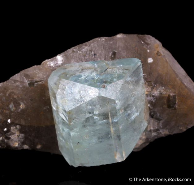 This is a Aquamarine on Smoky Quartz from Ponto de Marambaia, Padre Paraiso, Minas Gerais, Brazil. A classic, blocky, gem light blue-green Aquamarine crystal is nicely perched on a translucent smoky-Quartz crystal section.Data last checked on 1st Feb 2026