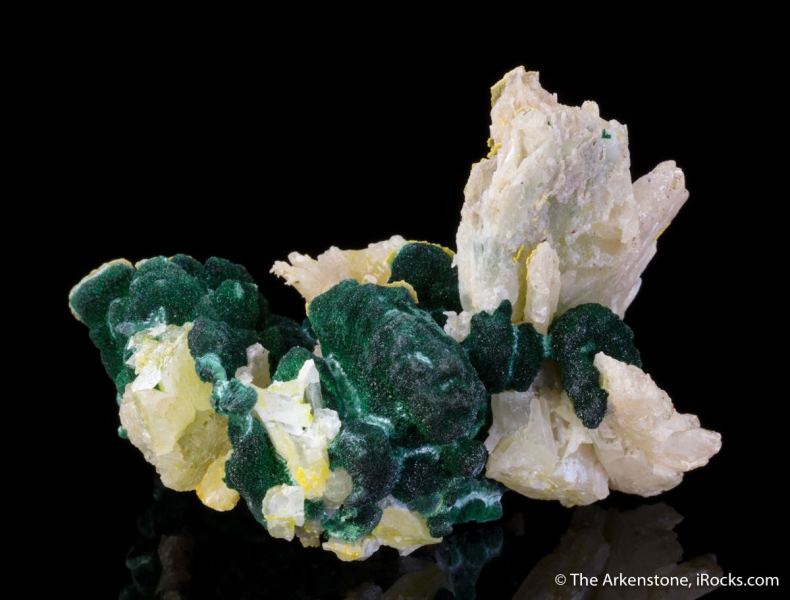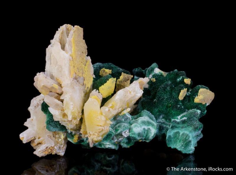 This is a Cerussite with Malachite from Rum Jungle, Northern Territory, Australia. A matrix of lustrous, dark emerald green malachite, in crystals to 2 cm in length, is the host for spear-like crystals of light tan cerussite crystals, to 3 cm in length.Data last checked on 27th Feb 2026 - specimen may no longer be available