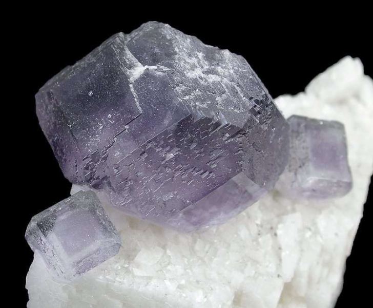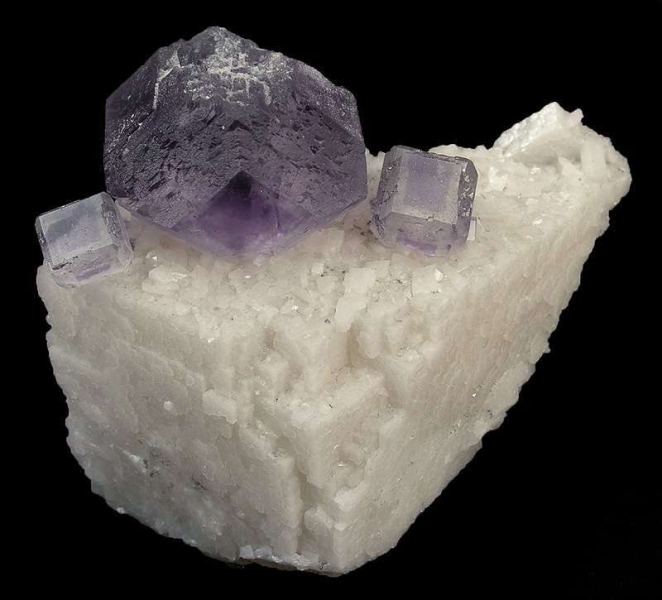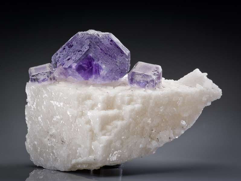 This is a Fluorite on Dolomite Floater from Shangbao, Hunan Province, China. Dramatic purple-zoned, cuboctahedral fluorites to 2.5 cm across, are perched on a thin, elongated crystal of dolomite, a floater that is complete all around!Data last checked on 11th Feb 2026 - specimen may no longer be available