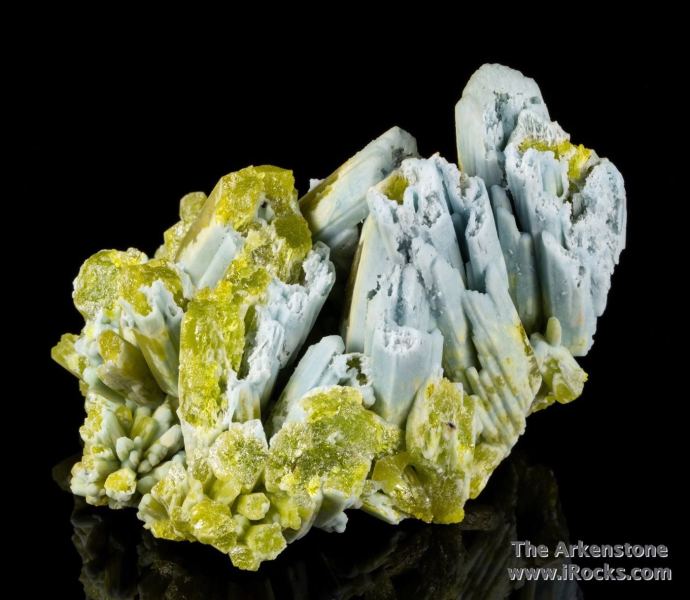 This is a Plumbogummite replacing Pyromorphite from Yangshuo Mine, Yangshuo Co., Guilin Pref., Guangxi Zhuang, China. This specimen is one of the few showing barely any replacement and mostly original pyromorphite is present: Partial pseudomorphs of plumbogummite after pyromorphite in crystals to 4.7 cm in length exhibit cavernous growth at the terminations and contrast with the display side which is colored a sky blue color.Data last checked on 28th Jan 2026