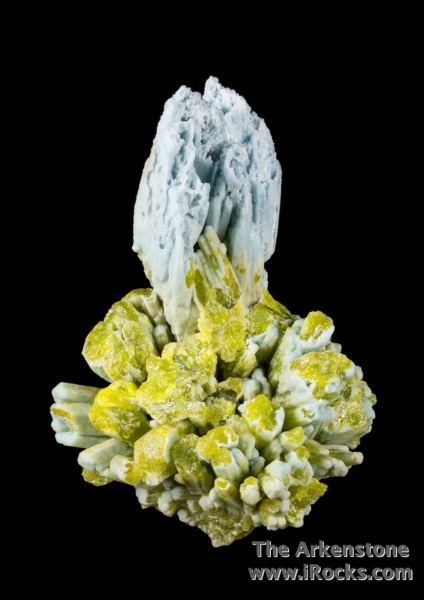 This is a Plumbogummite ps Pyromorphite from Yangshuo Mine, Yangshuo Co., Guilin Pref., Guangxi Zhuang, China. Rising aesthetically from a pyromorphite cleavage mass are two replaced crystals, to 6 cm in length, exhibiting cavernous and elongated hoppered growth and a wonderful sky blue color of plumbogummite.Data last checked on 28th Jan 2026 - specimen may no longer be available