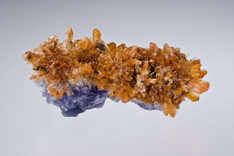 This is a Creedite on Fluorite from Abasolo Mine, Navidad, Durango, Mexico. Intensely orange crystals to 1.7 cm spray out form all directions along the top of a ridge of fluorite, which they encrust.Data last checked on 1st Mar 2026 - specimen may no longer be available