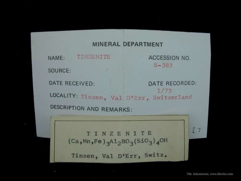 This is a Tinzenite (Tl) in Calcite and Hematite from Tinzen, Val D'Err, Switzerland (Type Locality). Tinzenite, a member of the Axinite Group, is a rare borosilicate.Data last checked on 16th Jan 2026