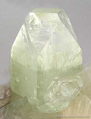 This is a Fluorapophyllite and Stilbite from Jalgaon, Maharashtra, India. Growing on a sliver of matrix, are two, large, blocky, crystals of glassy, bi-colored, fluorapophyllite, the largest of which is 7.0 cm in length.Data last checked on 16th Jan 2026 - specimen may no longer be available