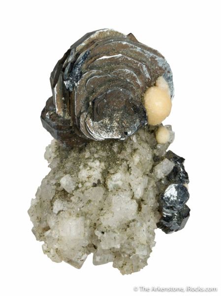 This is a Hematite Rose on Adularia from Lucendro, Gotthard, Switzerland. Perched aesthetically atop a drusy adularia (feldspar) matrix is a starkly standing, lustrous, black hematite rose, measuring 1.3 cm across, There are also a few, tiny spheres of light pink stilbite present as well.Data last checked on 24th Jan 2026 - specimen may no longer be available