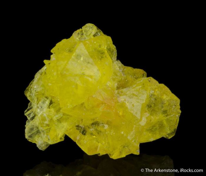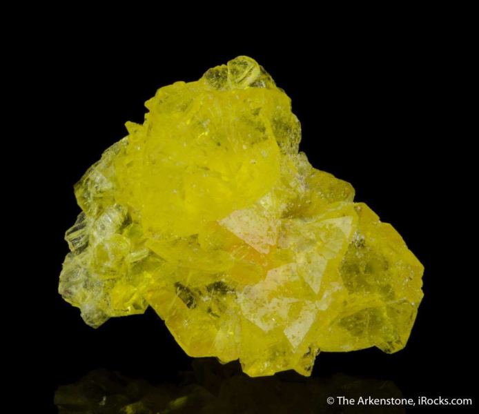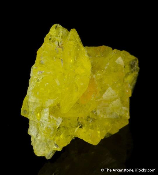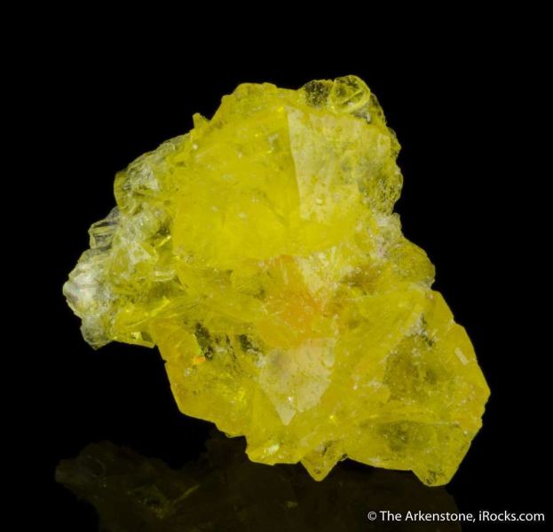 This is a Jouravskite from N'Chwaning III Mine, Kuruman, Kalahari MN field, Northern Cape Province, South Africa. A rosette of crystals of glassy and gemmy, lemon-yellow jouravskite are clustered together in a beautiful thumbnail sized specimenFrom: The Arkenstone