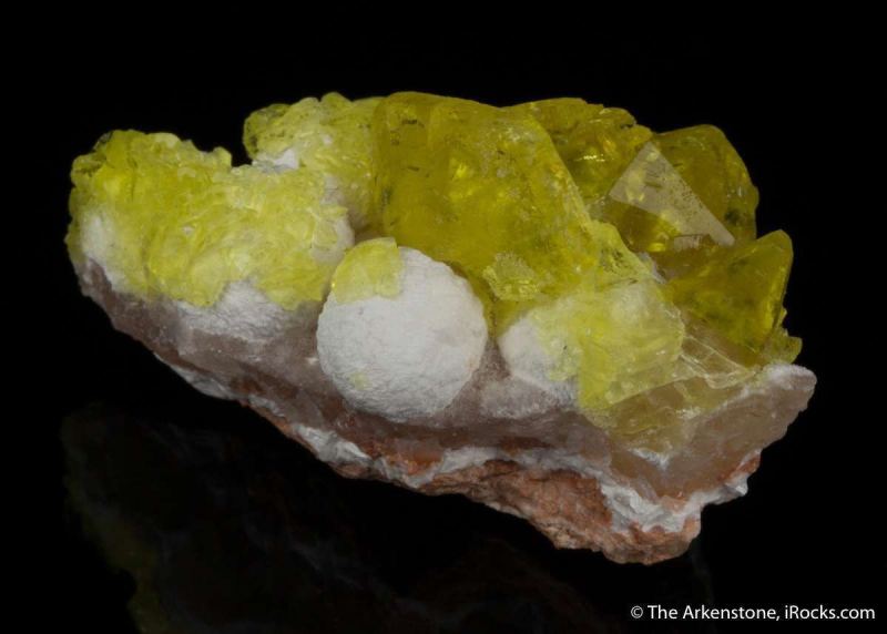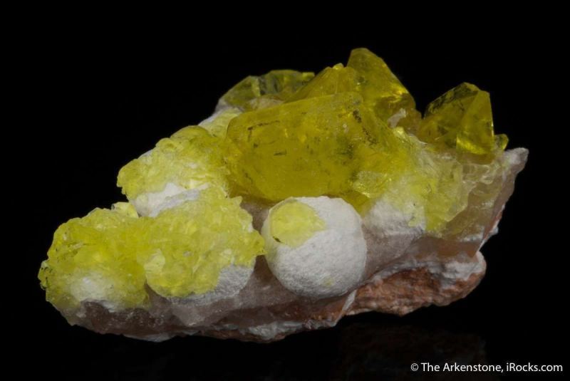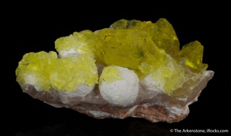 This is a Jouravskite on Xonotlite from N'Chwaning III Mine, Kuruman, Kalahari MN field, Northern Cape Province, South Africa. This is a sparkling miniature with two generations of lemon-yellow jouravskite crystals!Data last checked on 20th Jan 2026
