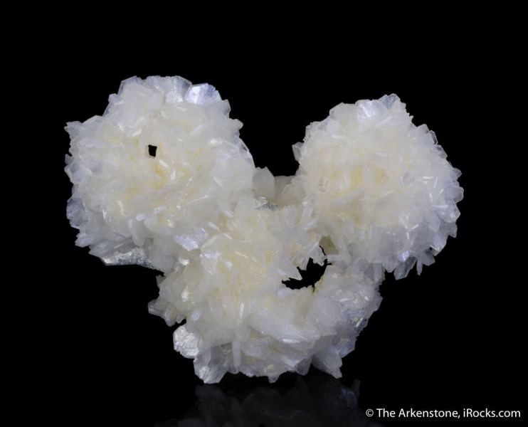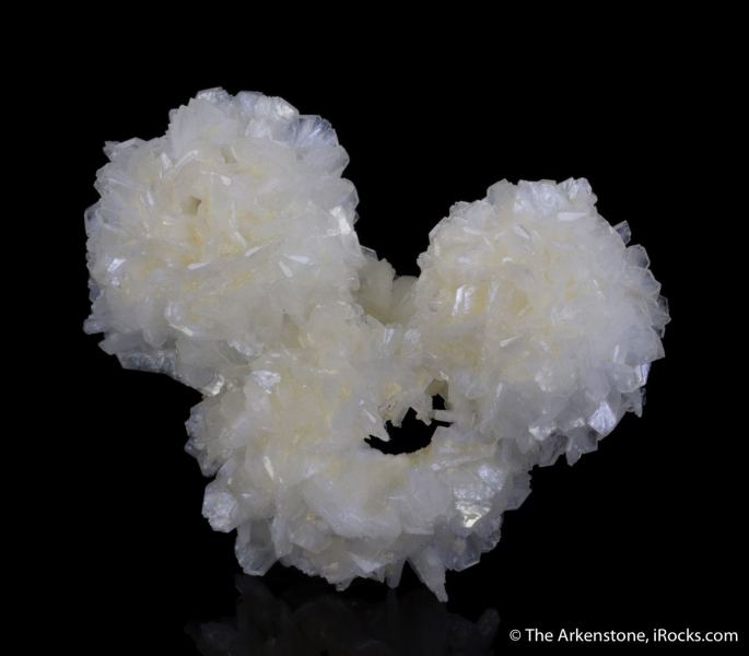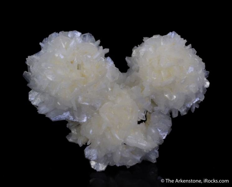 This is a Stilbite cast after Okenite from Pune, Maharashtra State, India. Somewhat resembling the Olympic rings, this aesthetic specimen features three casts of pearlescent stilbite, with crystals to 7 mm in length, after okenite.Data last checked on 3rd Feb 2026 - specimen may no longer be available